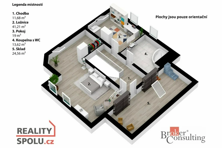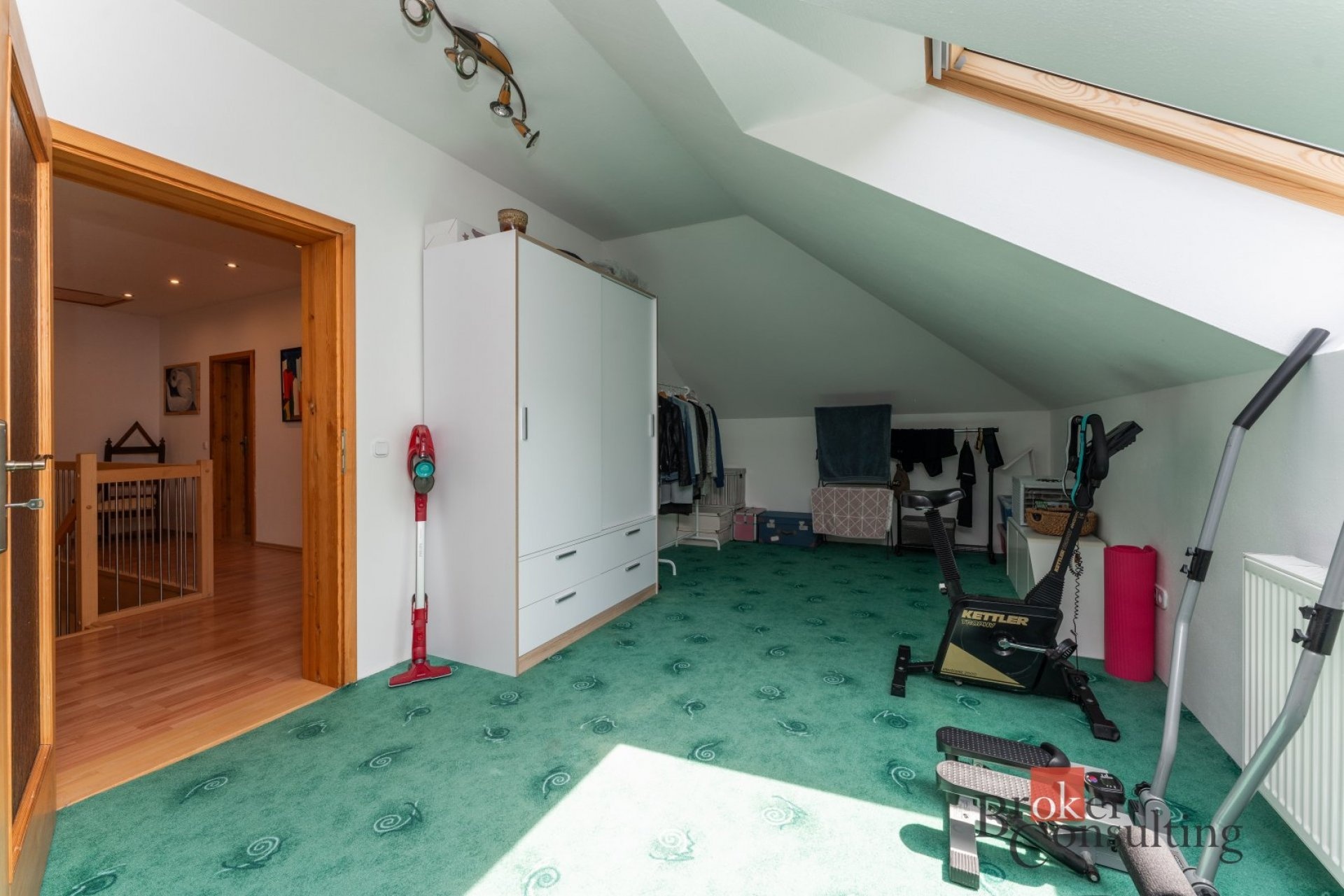 V 1. patře se dále nachází ložnice s šatnou (26,68 m² + 14,53 m²) a výhledem do zelené krajiny. Součástí 1. patra je dále chodba (11,68 m²), pokoj (24,56 m²), koupelna s toaletou (13,62 m²) a dětský pokoj (19,01 m²). Nad obytnou částí se nachází půdní prostor.