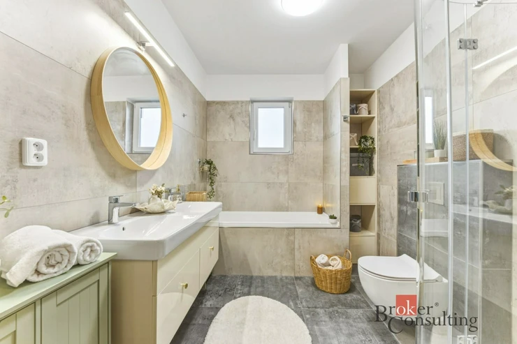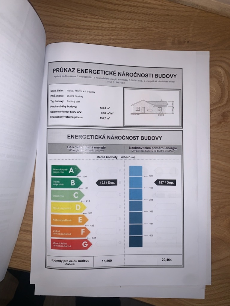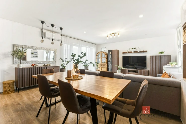 Dům je vybaven moderními technologiemi pro komfortní a úsporné bydlení. Podlahové vytápění napojené na tepelné čerpadlo spolu s klimatizací a venkovními žaluziemi zajišťuje příjemné klima v interiéru po celý rok i dostatek soukromí. Klimatizaci je navíc možné pohodlně ovládat také prostřednictvím mobilního telefonu. Na zahradě se nachází také retenční nádrž na dešťovou vodu, do které je svedena voda z okapů a kterou lze využít například pro zalévání zahrady.