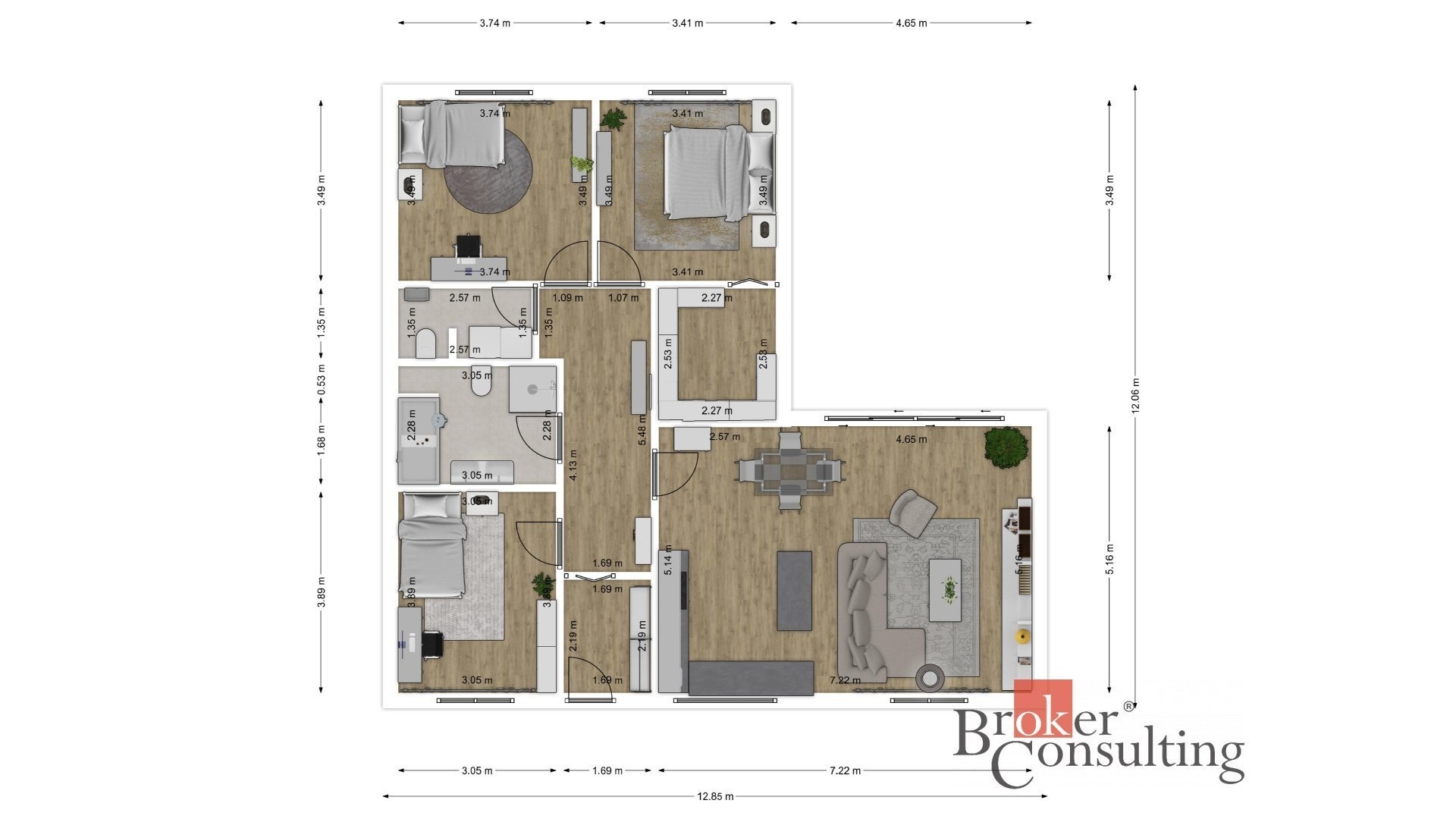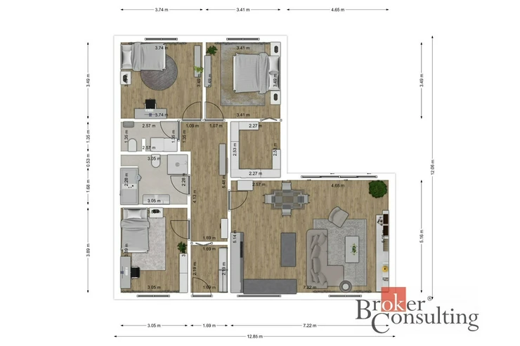 Dominantou domu je obytný prostor s přímým vstupem na terasu a zahradu díky velkým proskleným dveřím. Dispozice domu nabízí tři samostatné ložnice, koupelnu, samostatnou toaletu a praktickou technickou místnost pro pračku a sušičku. Z hlavní ložnice je navíc vstup do samostatného velkého šatníku s vestavěnými skříněmi. Součástí domu je také částečně pochozí podkroví o velikosti přibližně 15 m², které slouží jako praktický úložný prostor.