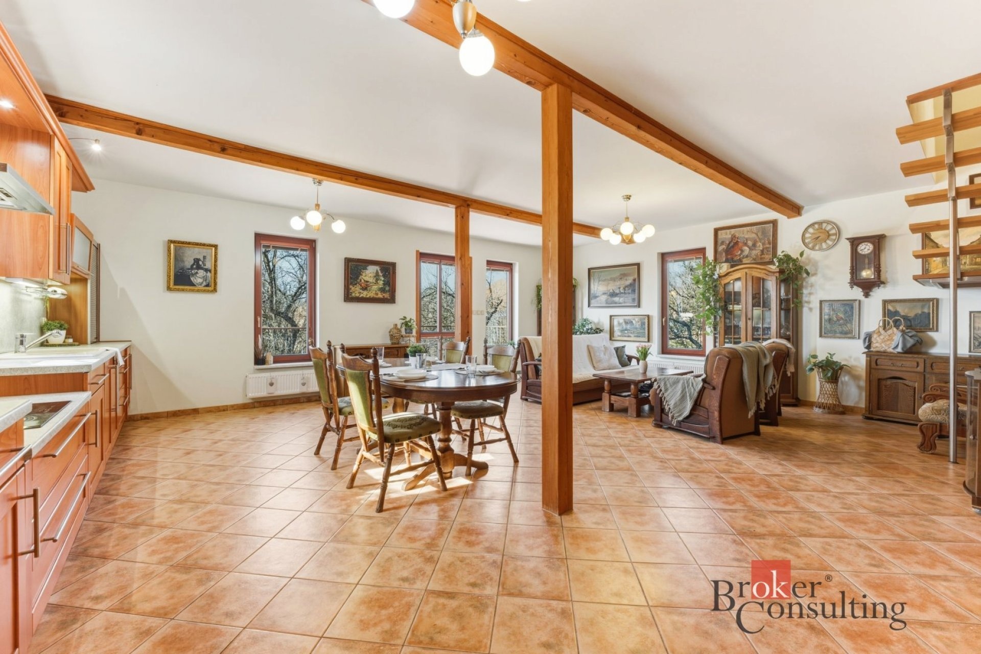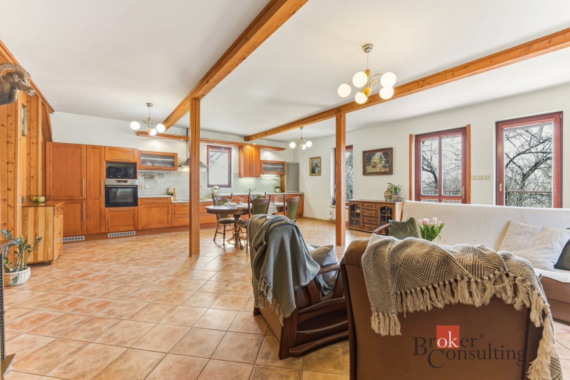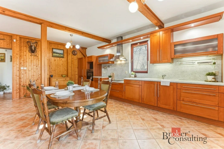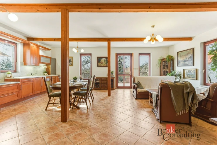 Dispozičně je dům řešen jako 4+kk a díky promyšlenému rozvržení prostoru působí velmi vzdušně a zároveň prakticky. Srdcem celého domu je prostorný obývací pokoj s kuchyní o velikosti 47,5 m², odkud se přímo vstupuje na velkorysou terasu o velikosti 26 m². Ta se snadno stane místem pro letní grilování, rodinné oslavy i klidné ranní kávy s výhledem do okolní krajiny.