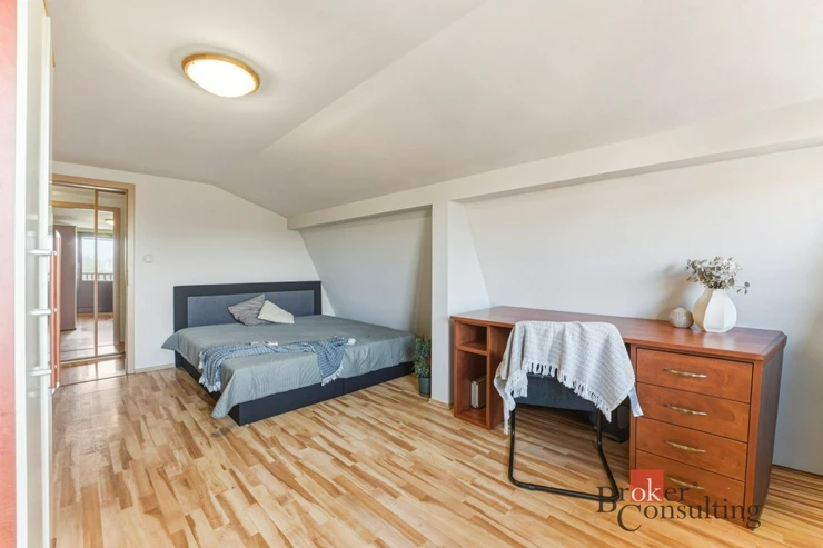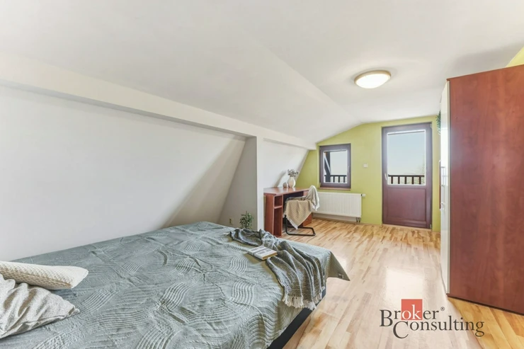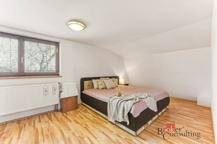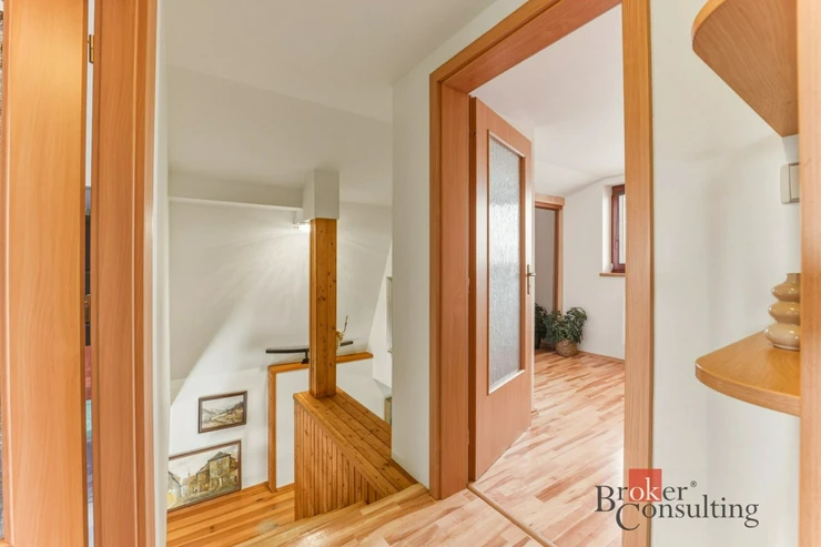 V patře najdete klidovou část domu – ložnici orientovanou na východ (16,8 m²) s vestavěnou skříní a dva velké pokoje (19,6 m²), orientované na západ. Všechny místnosti v patře jsou neprůchozí, což zajišťuje dostatek soukromí pro každého člena domácnosti. Oba pokoje mají přístup na lodžii o velikosti 7 m², odkud si můžete vychutnat krásné západy slunce. V patře se nachází také druhé samostatné WC.