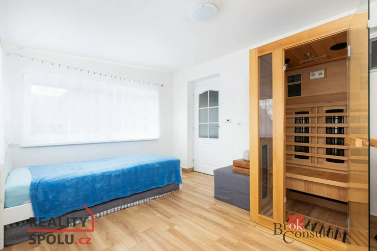 Pojďme si shrnout ještě pár detailů, které Vás jistě budou zajímat. Dům se vytápí kotlem na hnědé uhlí s dávkovačem a teplo je kromě vstupní chodby, koupelny s podlahovým topením a jednoho pokoje s vlastním elektrickým podlahovým topením rozvedeno do radiátorů. U domu je přípojka plynu, kdyby chtěl někdo plynový kotel. Na pozemku je ještě přístřešek pro relaxaci, pro parkování a kůlna na nářadí. Navíc je zde příprava pro instalaci vířivky. Vstupní brána je na dálkové ovládání, pro bezpečí i kamera. V pokoji, který vznikl z původní terasy, zůstává infrasauna.