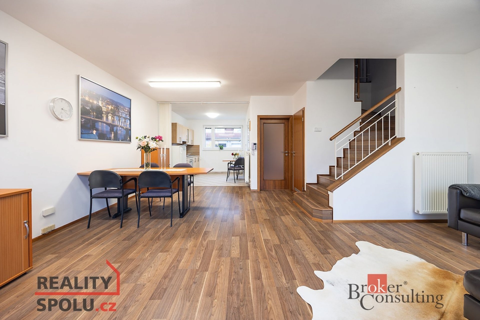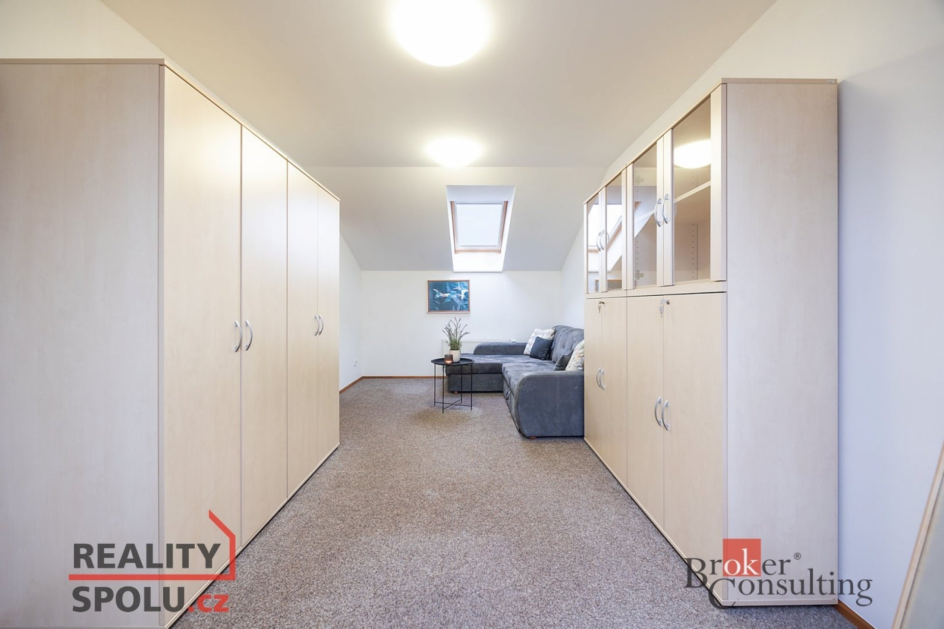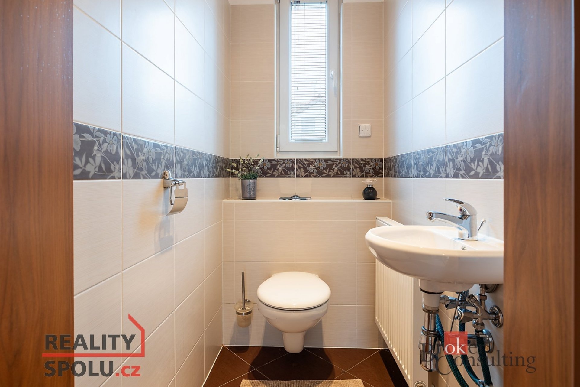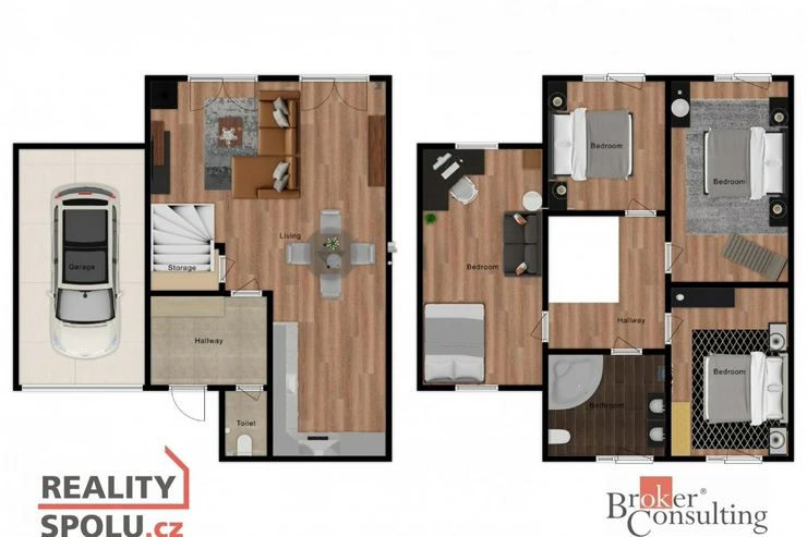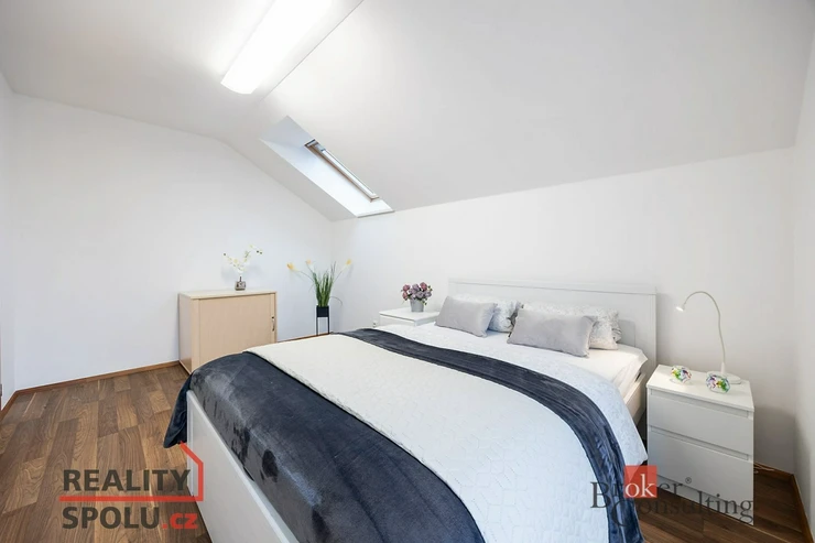 Dole se nachází chodba, toaleta s umyvadlem, technická místnost a samozřejmě obývací pokoj s kuchyňským koutem. V prvním patře pak najdete 4 pokoje a velkou koupelnu s rohovou vannou, dvěma umyvadly a toaletou. Navíc se v jednom pokoji nachází příprava vody a odpadů a je tedy možnost zde vybudovat druhou koupelnu.