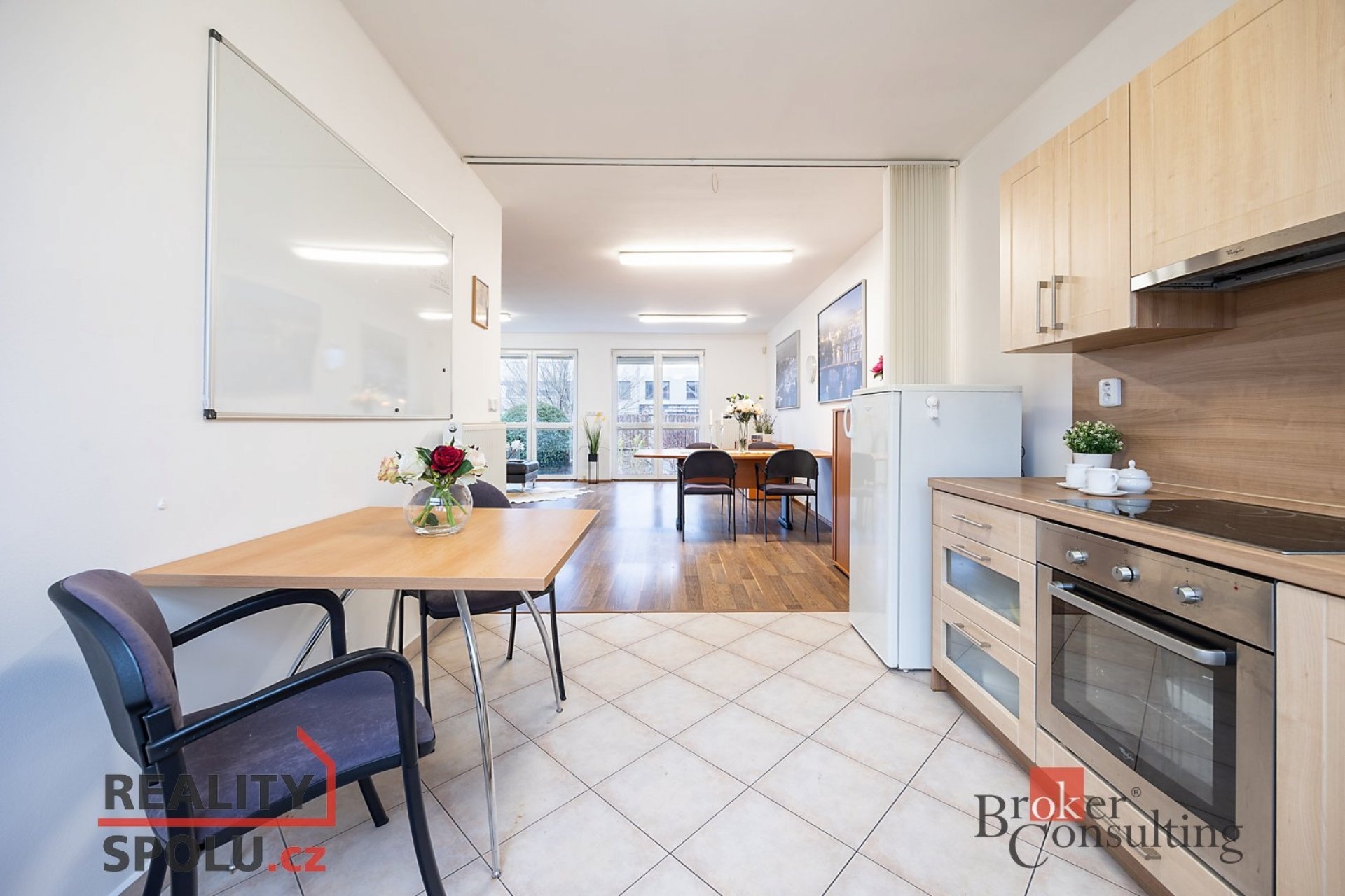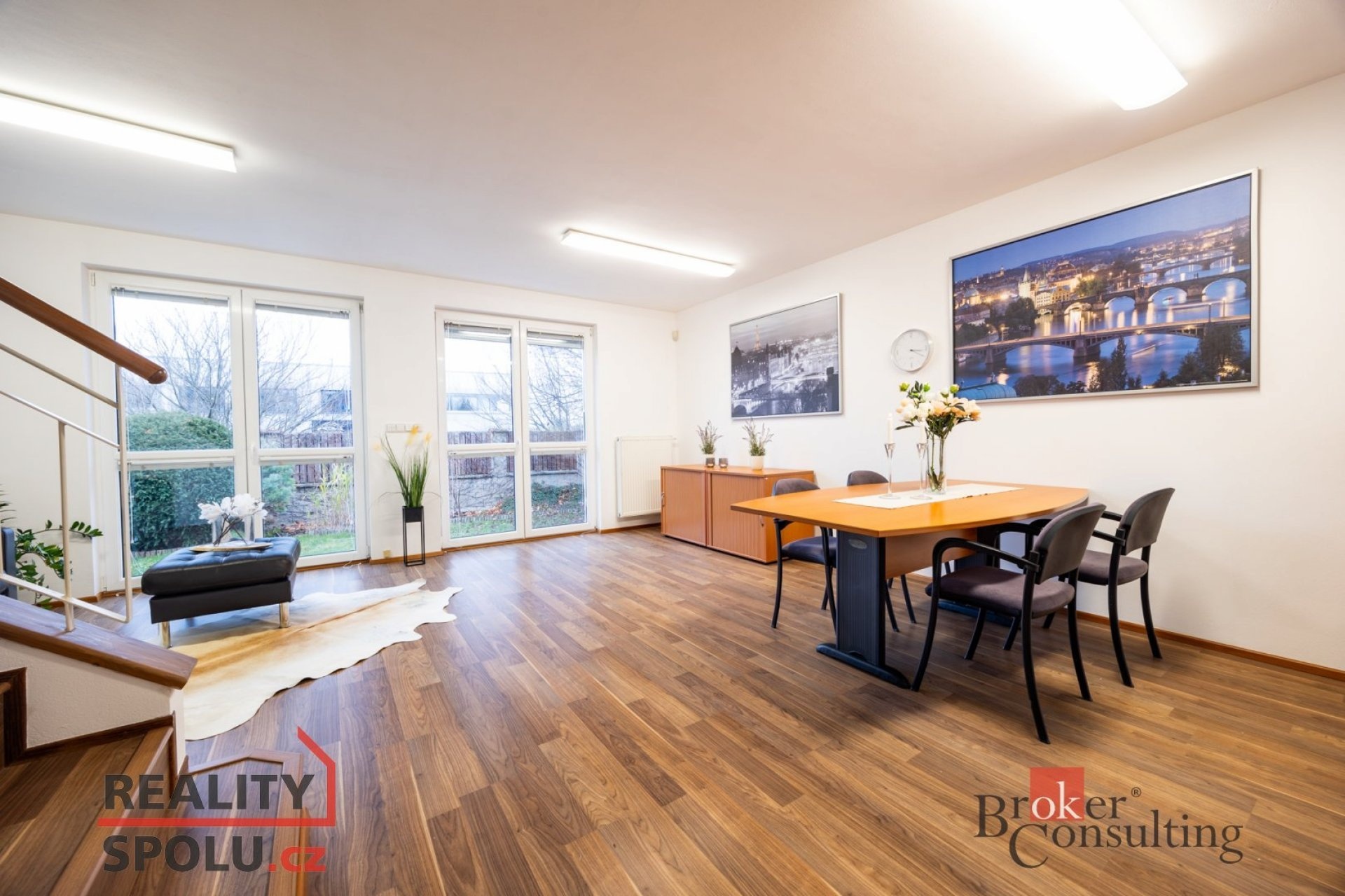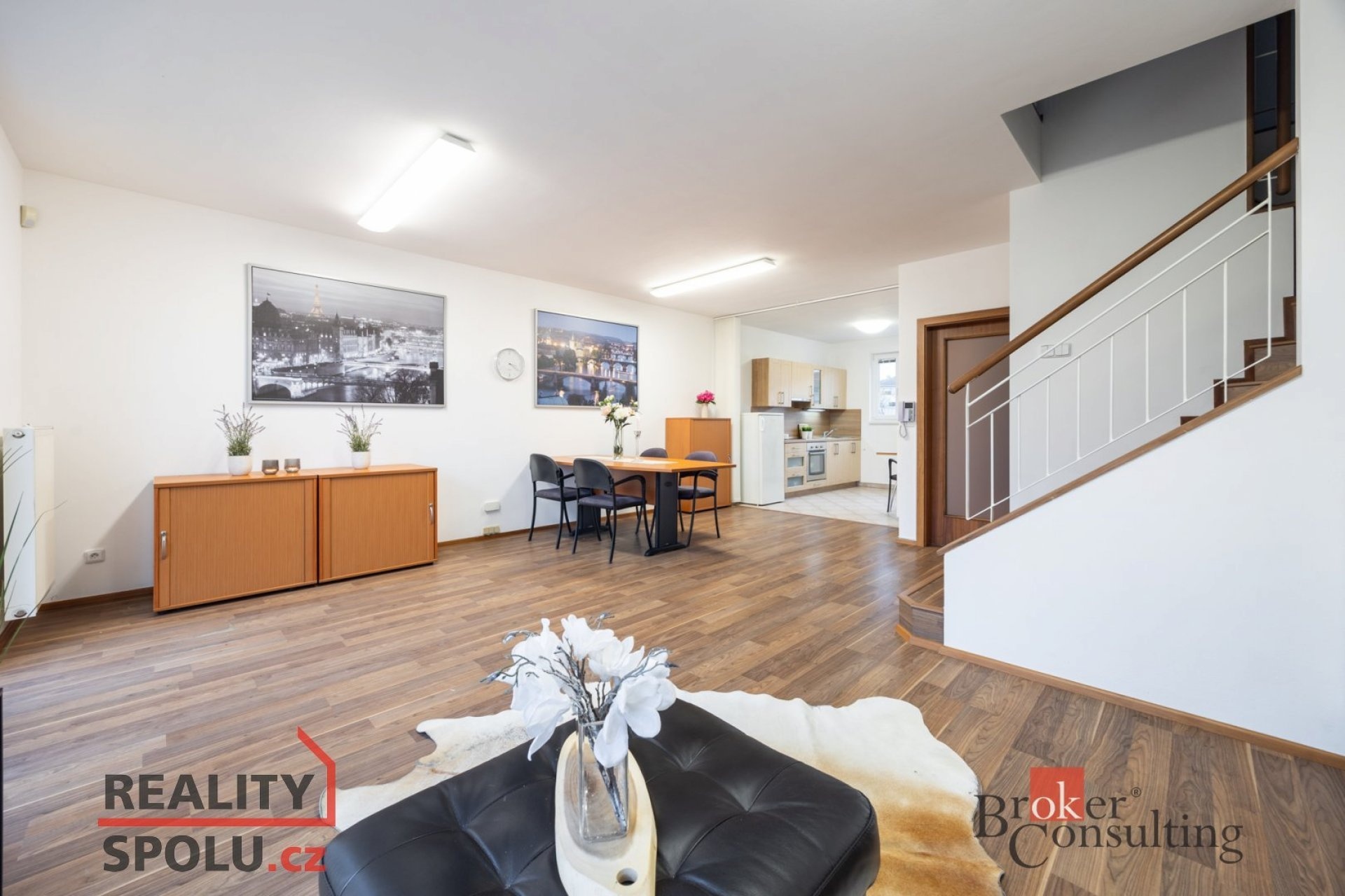Dole se nachází chodba, toaleta s umyvadlem, technická místnost a samozřejmě obývací pokoj s kuchyňským koutem. V prvním patře pak najdete 4 pokoje a velkou koupelnu s rohovou vannou, dvěma umyvadly a toaletou. Navíc se v jednom pokoji nachází příprava vody a odpadů a je tedy možnost zde vybudovat druhou koupelnu.