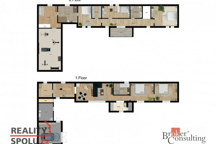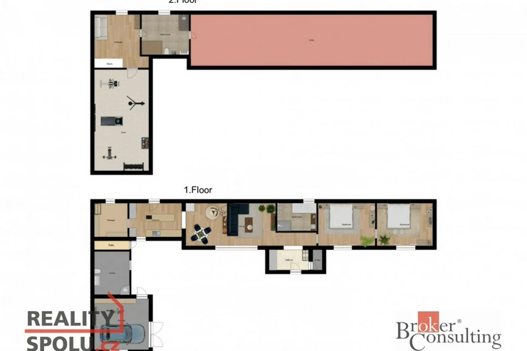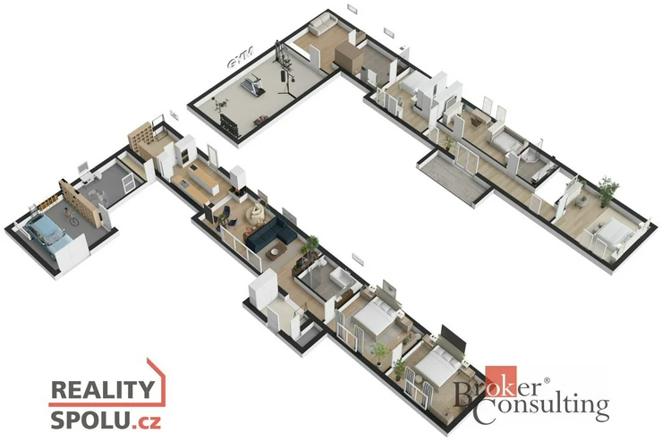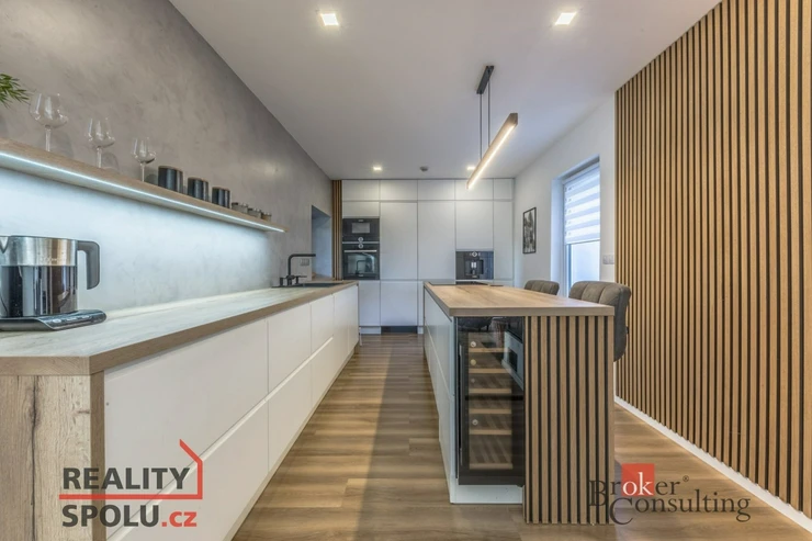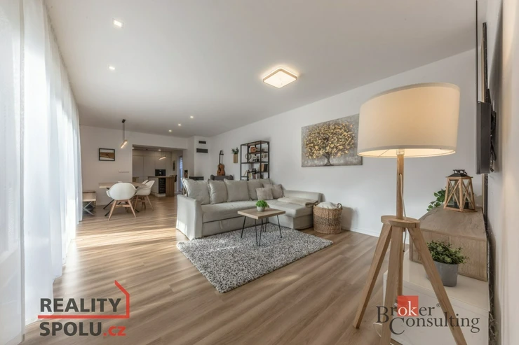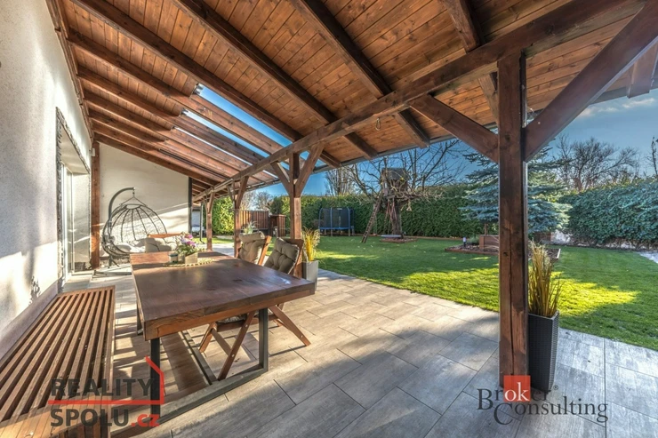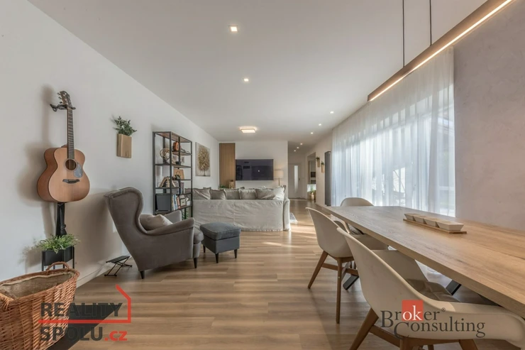 Dispozice domu: na přízemí se nachází vstupní hala, koupelna s vanou, sprchovým koutem, toaletou s umyvadlem, dvěma ložnicemi, kde každá disponuje prostornou vestavnou šatní skříní. Světlý obývací pokoj s jídelnou je útulný i díky krbovým kamnům, navazující kuchyň umožňuje propojení s obývacím pokojem, je zde i prostorný špajz. Z kuchyně je přímý vstup na terásku za domem, kde lze ráno ráno posnídat. Hlavní venkovní sezení je situované u obývacího pokoje v zahradě. Samostatně přístupná technická místnost, která slouží i jako prádelna, s pračkou a se sušičkou je hned vedle garáže (22 m2). Do patra se dostaneme po točitých schodech, tuto část majitelé využívají pro relaxaci. Najdeme zde velkou koupelnu s toaletou, se sprchovým koutem, saunou, odpočívárnu a prostornou pracovnu s fitness koutem.