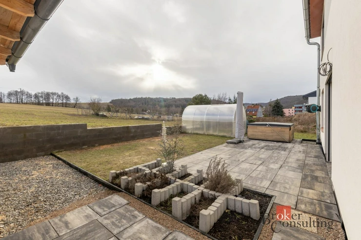 Exteriér domu a zahrada jsou připraveny k dalšímu dotvoření dle představ nového majitele – k dispozici jsou již betonové patky pro pergolu, příprava na saunu, venkovní technologie i další rozvody, které umožňují snadné navázání na již realizované řešení.