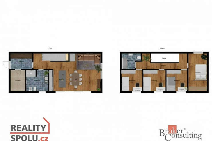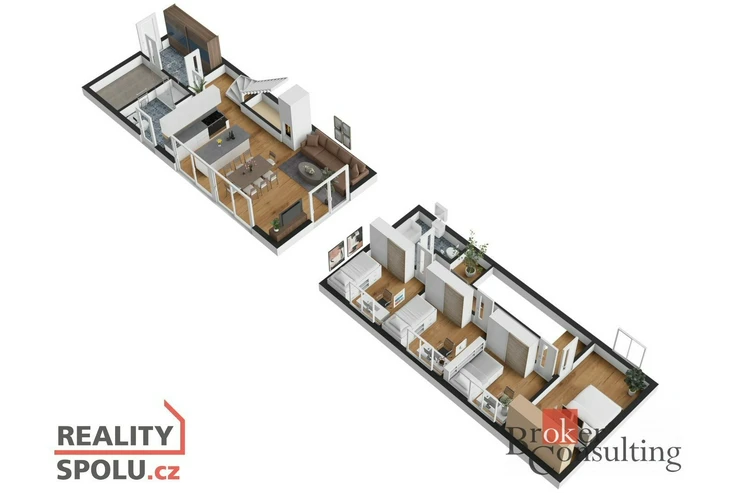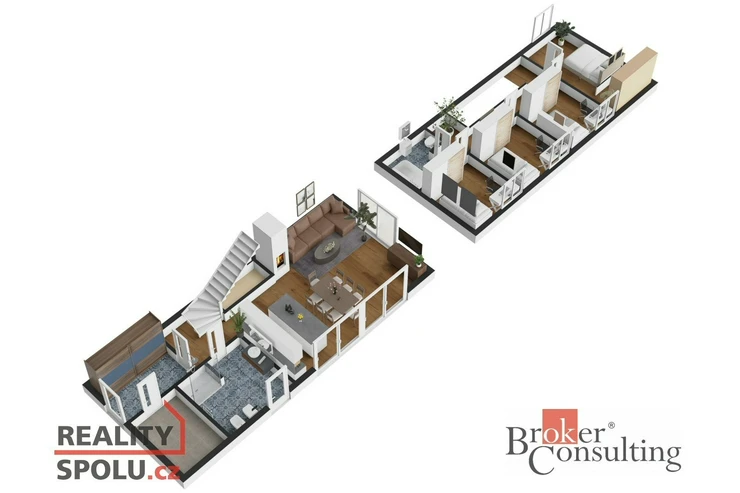 Dominantou přízemí je otevřený obytný prostor s obývacím pokojem, jídelnou a kuchyní, který je přímým vstupem propojen s terasou a zahradou. Dále se zde nachází předsíň, technická místnost a koupelna se sprchovým koutem a toaletou. V horním patře je situována hlavní ložnice se šatnou, tři další samostatné pokoje a druhá koupelna s vanou a WC.