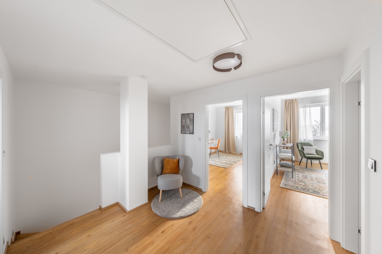 The house is equipped with a heat pump, underfloor heating, heat recovery ventilation (rekuperace), and solar panels, which significantly reduce operating costs. Living comfort is further enhanced by high-quality triple-glazed windows, exterior electric blinds, and excellent insulation throughout the entire house. The standard also includes an electric sliding gate and preparation for charging an electric vehicle. A practical bonus is the additional storage space under the roof, offering plenty of room for seasonal items.