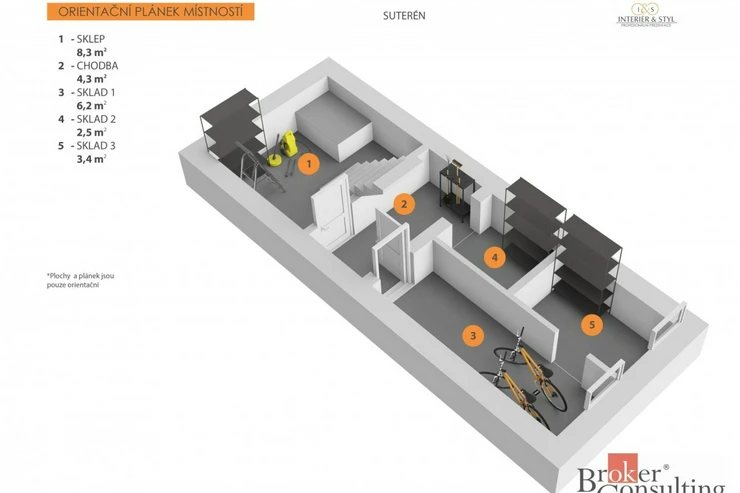 V přízemí se nachází prostorná vstupní hala se schodištěm a vstupem do sklepa, samostatné WC, koupelna, šatna, komora s pračkou, ložnice, velkorysý obývací pokoj s jídelnou a kuchyň se spižírnou. V patře jsou tři ložnice, šatna a koupelna připravená k dokončení podle představ nového majitele.