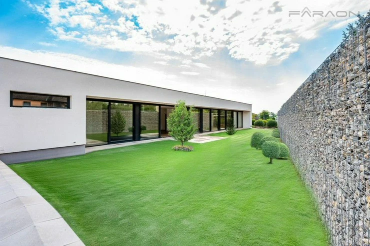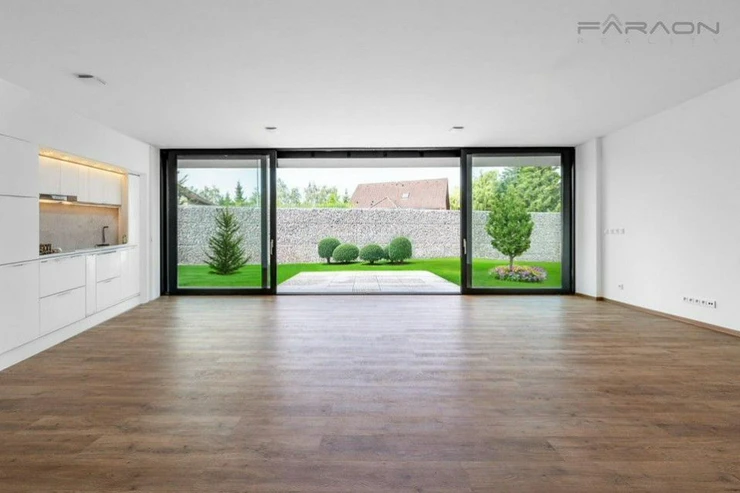 The single-storey practical layout includes an open concept (50m2) living room with preparation for the kitchen, dining area and direct access to the garden terrace and subsequently to the garden, as well as a master bedroom with a dressing room and en-suite bathroom, 2 further bedrooms with en-suite bathrooms, a separate toilet for guests separately, study, technical room, vstupní hall - vestibule.