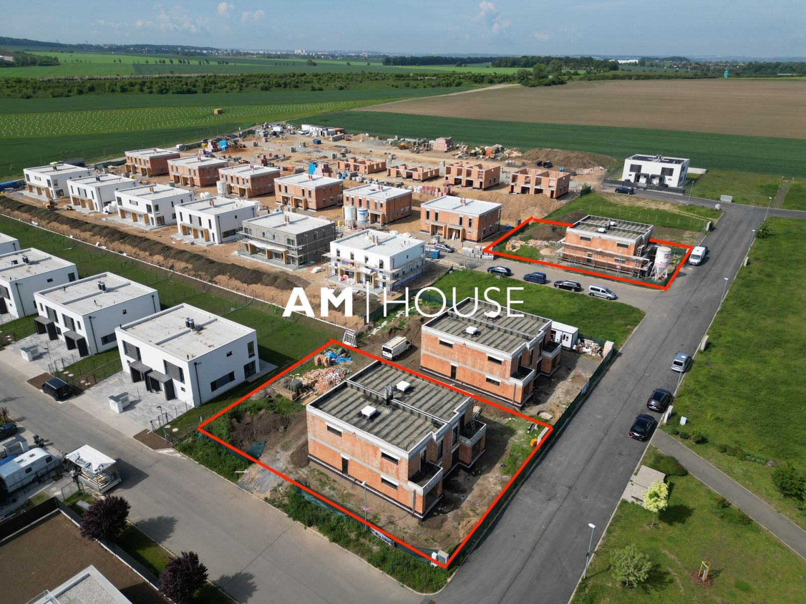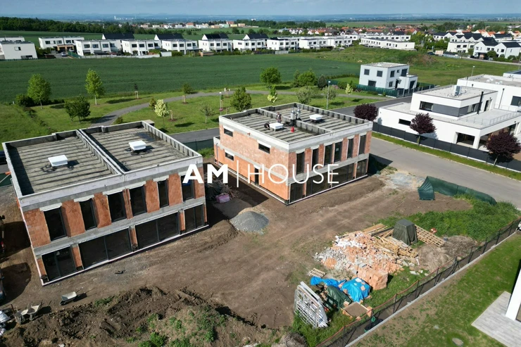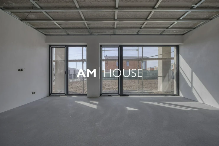 Každý dům má garáž a 2x venkovní parkovací stání. V přízemí za vstupem do domu je prostorná chodba (8,6 m2), dále je zde koupelna se sprchovým koutem a s WC, z chodby vejdete do velkorysého obývacího pokoje s přípravou pro kuchyňský kout o velikosti 32,87 m2. Z obývacího pokoje a kuchyně dostanete do zahrady.