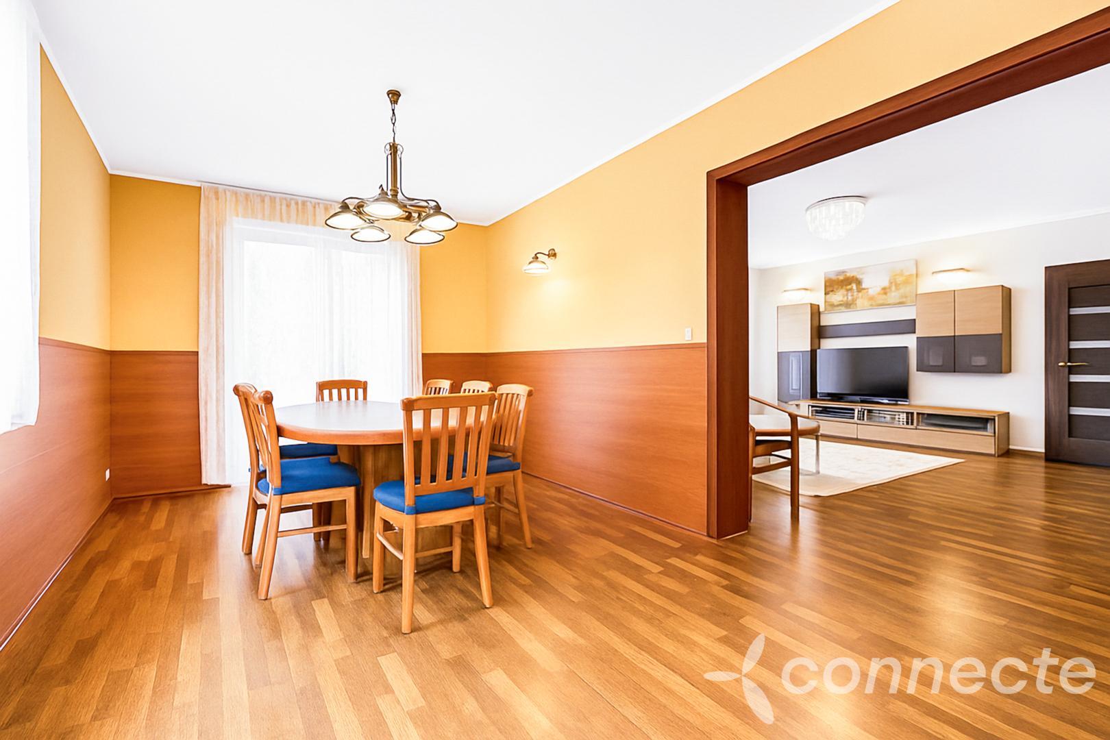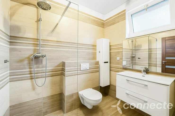 After entering the house, you will find yourself in the hallway, from which you can access the bathroom with a shower and toilet, the utility room and the main living area of the house. The living room with a fireplace really provides enough space for spending free time with the family. A big advantage is the separate kitchen with a dining room, which is connected to the living room by a wide portal. On the ground floor there is also a bright study with its own entrance to the terrace.