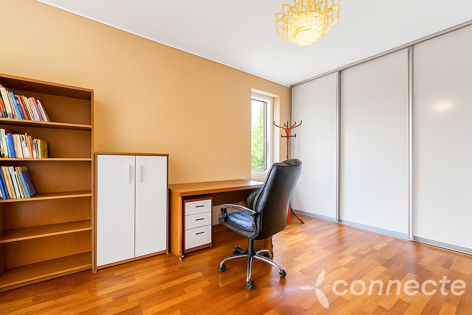 You go up the stairs to the first floor and enter the spacious hall, which can be another full-fledged living room. An ideal place to sit in the evening before going to bed. On the first floor there are three bedrooms, the largest of which has its own dressing room and entrance to the bathroom with a bathtub and toilet.