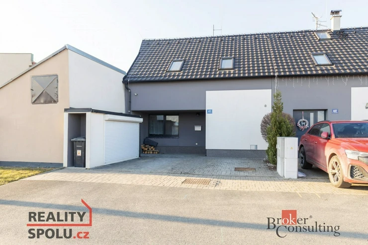 K domu náleží dvě parkovací místa přímo před domem a samostatný venkovní úložný prostor umístěný před domem, vhodný pro kola, kočárky či sportovní vybavení.
