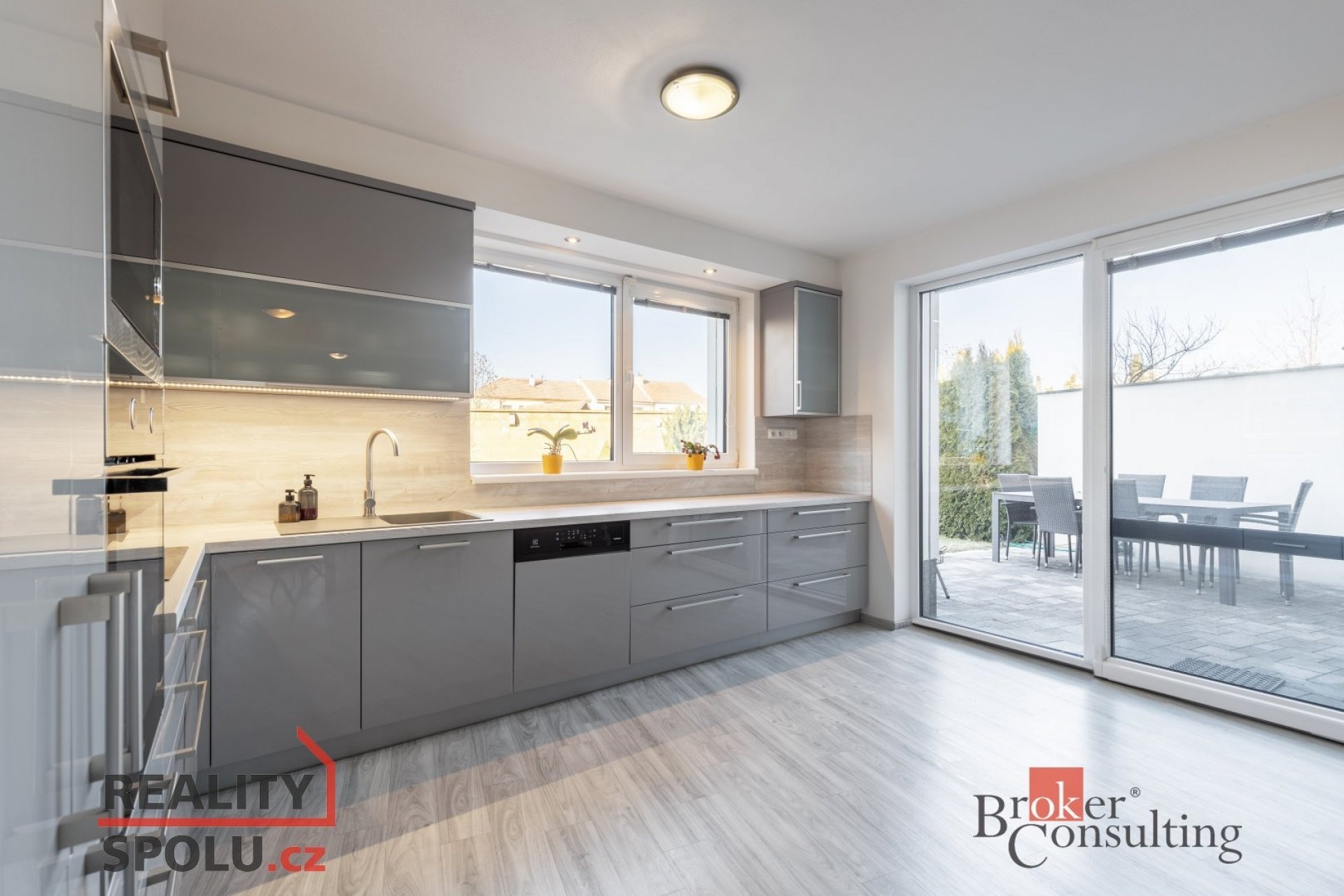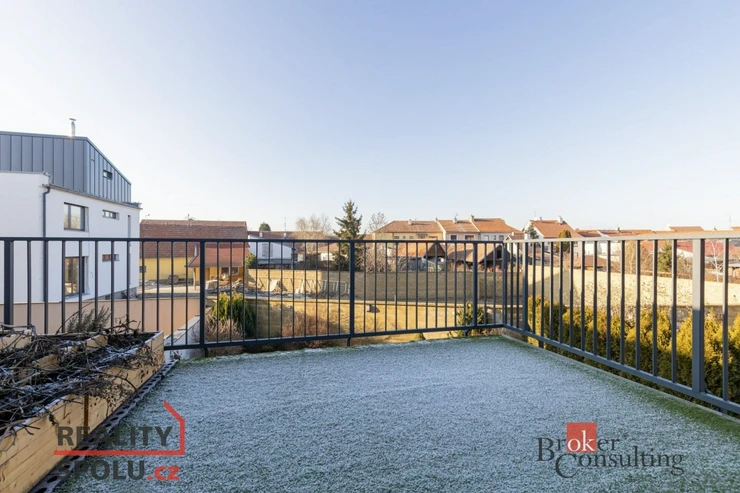 Na obytnou část navazuje vlastní terasa se zahradou, ideální pro relaxaci, rodinné posezení i bezpečné místo pro dětské hry.