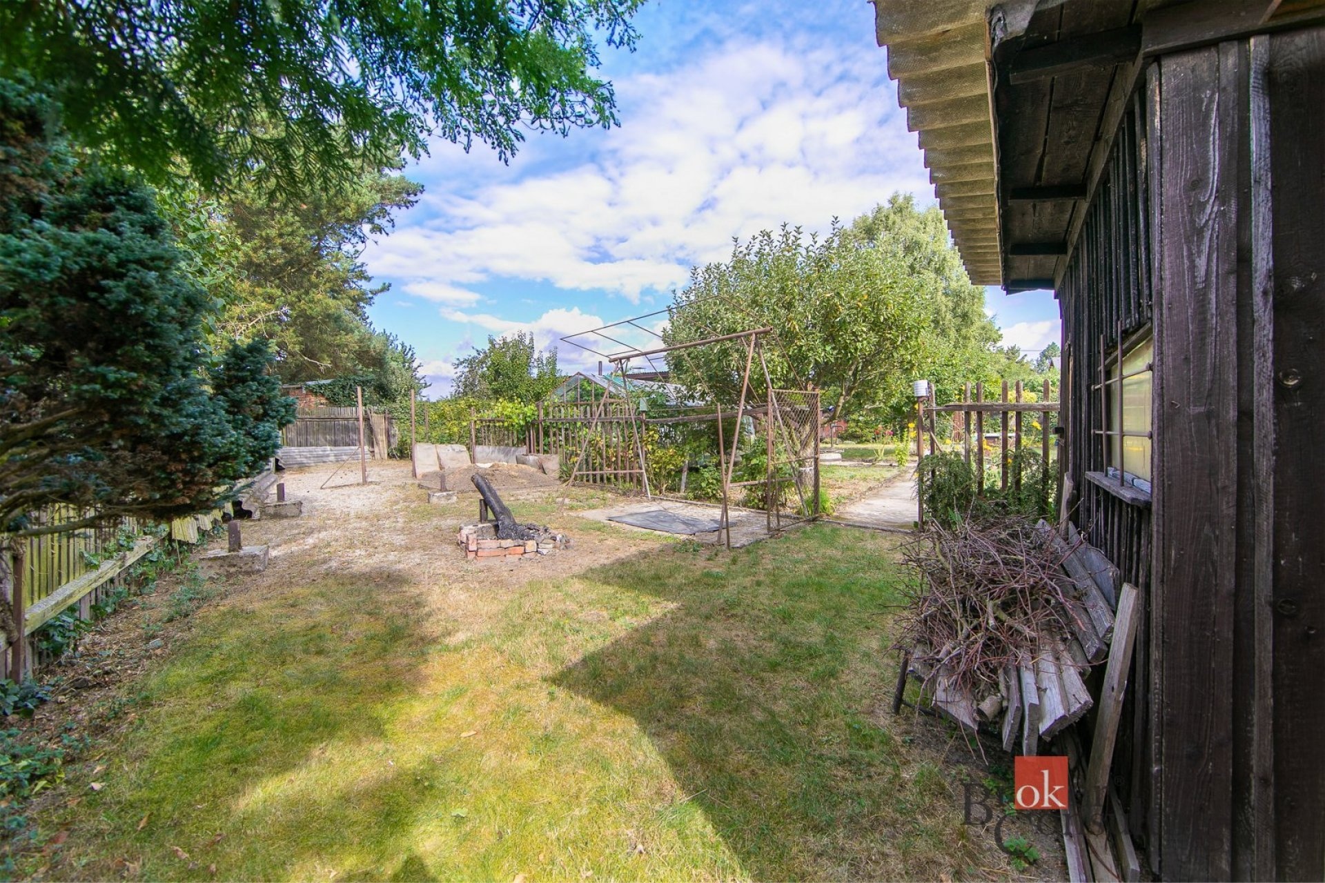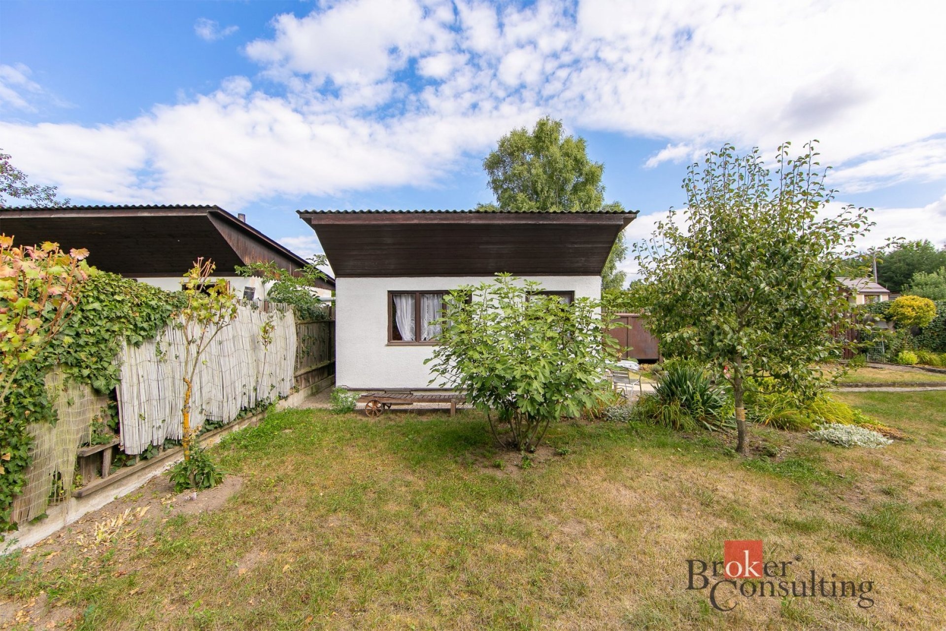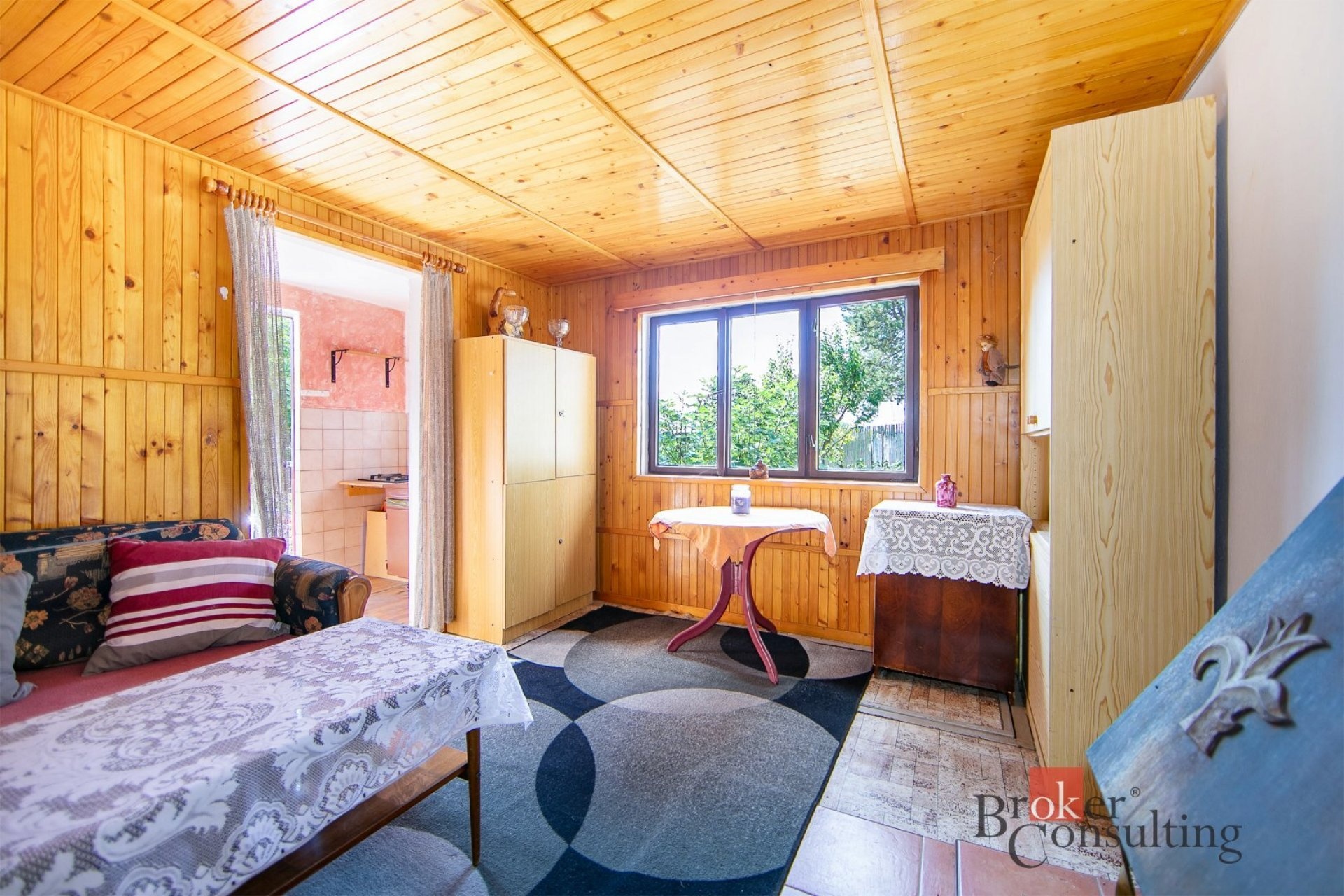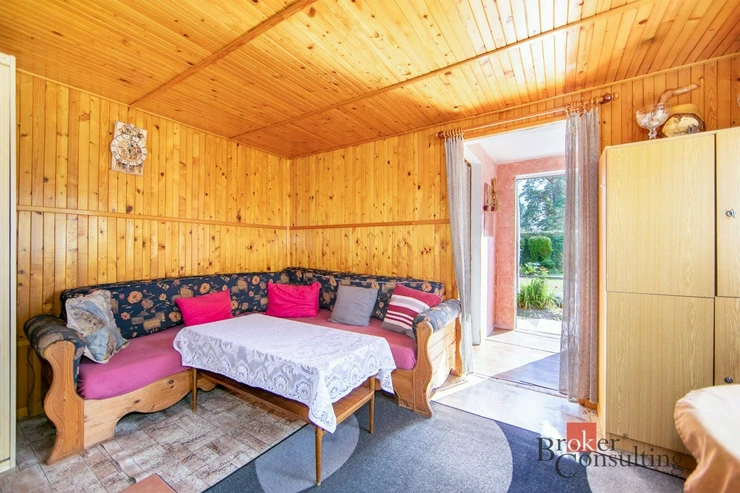 Chata je v dobrém technickém stavu, ihned obyvatelná a připravená k využívání. Vstupní kuchyň je světlá a nabízí krásný výhled do zahrady i přímý vstup ven. Obývací pokoj s dřevěným obložením působí útulně a vytváří příjemnou atmosféru typickou pro rekreační objekty.