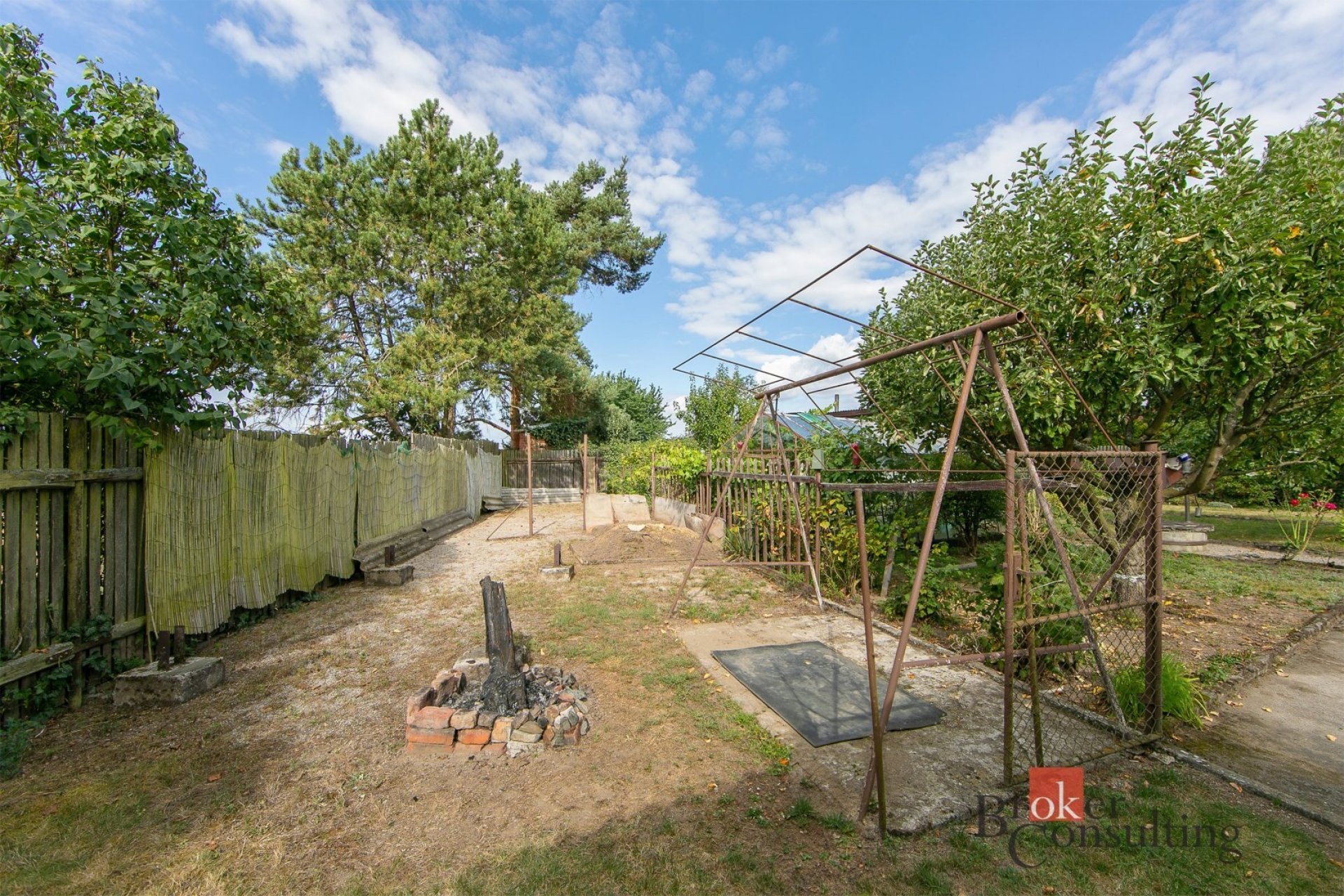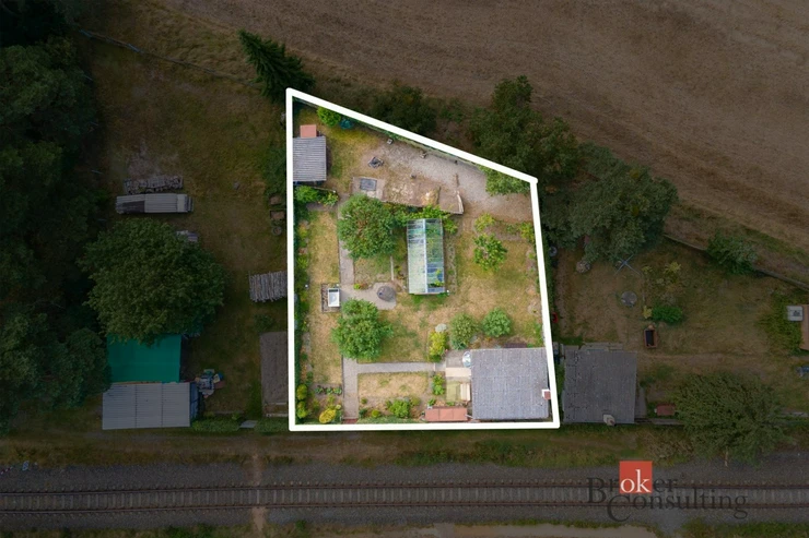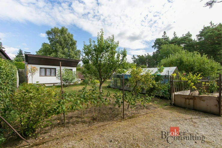 Chata stojí na pronajatém pozemku, což se příznivě odráží v nižší pořizovací ceně oproti obdobným objektům na vlastních pozemcích.