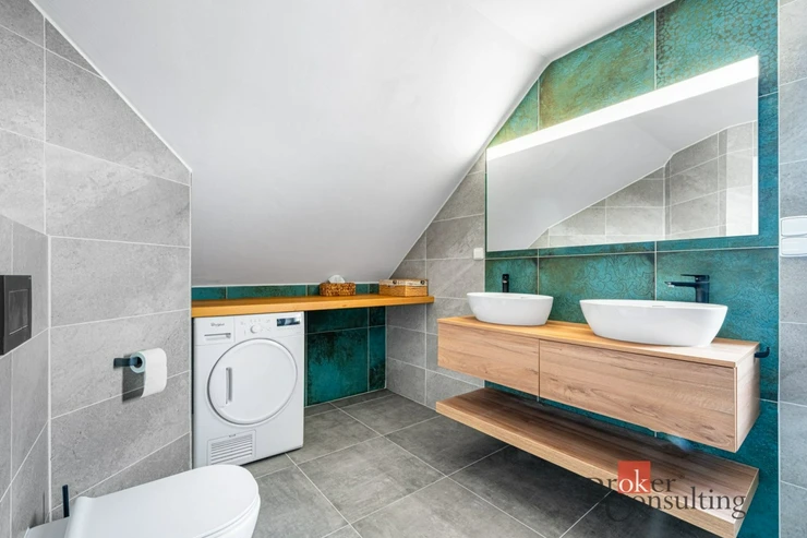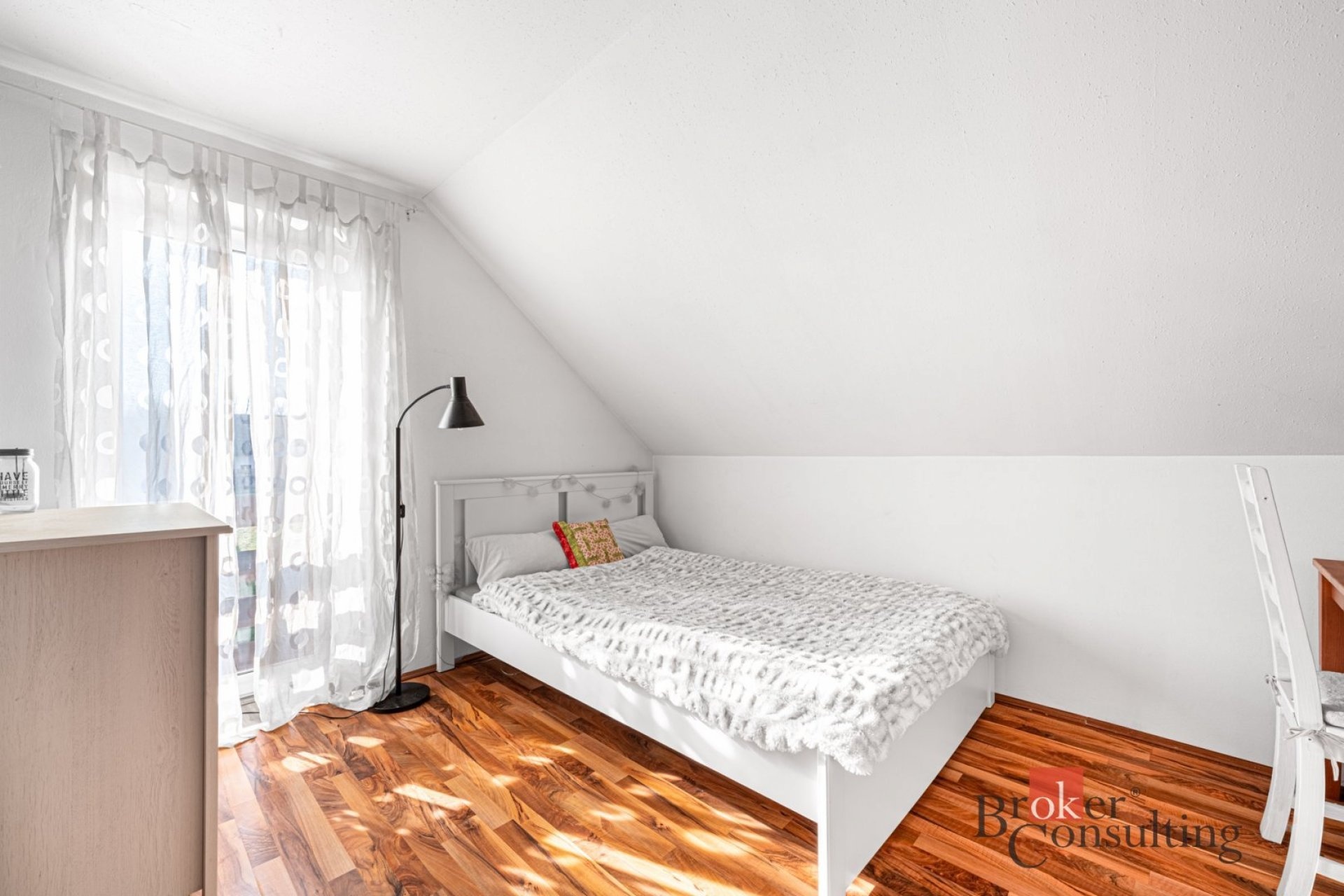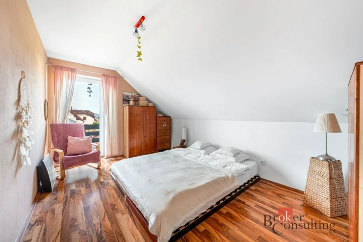 V patře je druhá koupelna, tři samostatné pokoje a sauna. Ze dvou pokojů je přímý vstup na balkón.