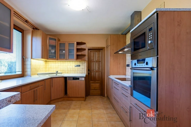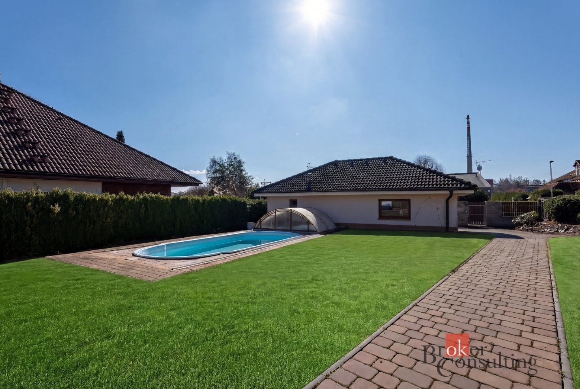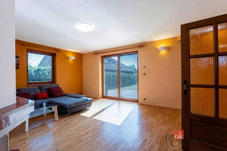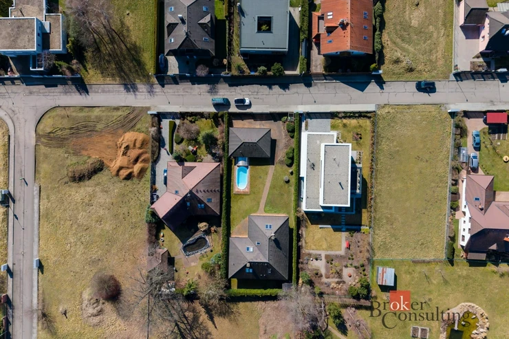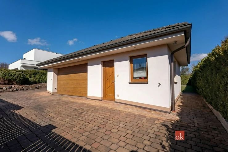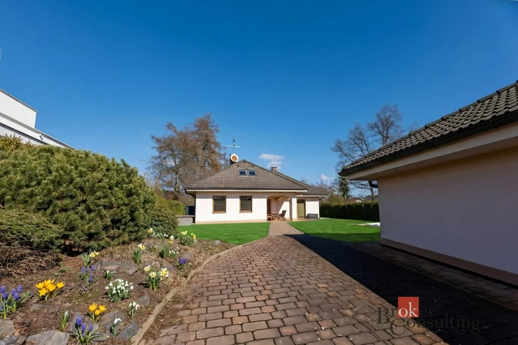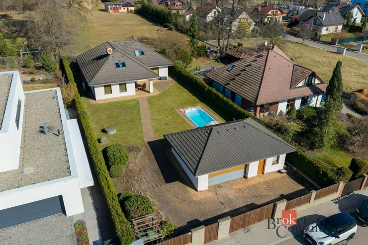 Součástí nemovitosti je také samostatná garáž pro dva vozy s dílnou a koupelnou, přičemž objekt slouží i jako technické zázemí pro bazén. Vysoký standard exteriéru doplňuje vlastní studna, kapénková závlaha podél živého plotu, udržovaná zahrada s okrasnou skalkou a zámková dlažba vedená až k domu. Celek působí reprezentativně, prakticky a zároveň velmi příjemně pro každodenní rodinný život.