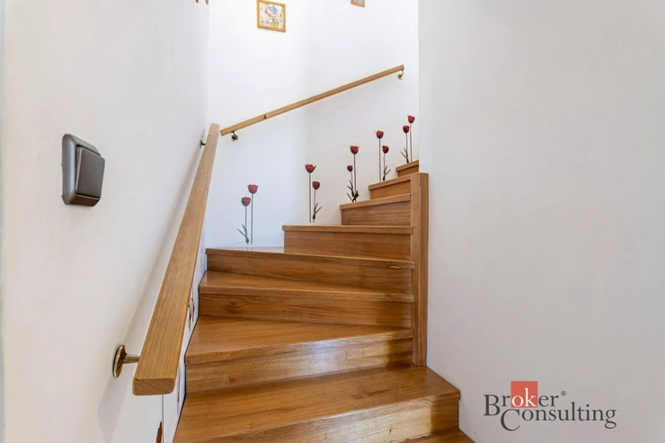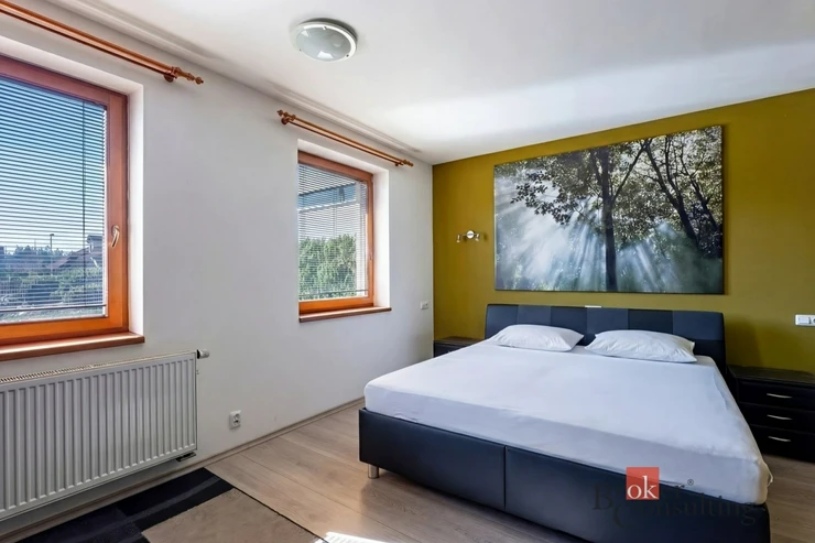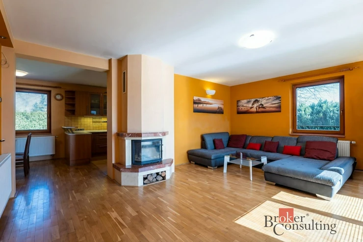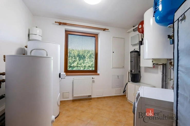 O vytápění se stará tepelné čerpadlo Viessmann Vitocal, doplněné akumulační nádrží, zásobníkem teplé vody, záložním elektrokotlem a krbem s výměníkem. Komfort dále zvyšuje podlahové vytápění ve vybraných částech domu, centrální vysavač, zateplení domu i vyhřívané měděné okapy a svody, které oceníte zejména v zimních měsících. K vysokému standardu přispívají také kvalitní dřevěná okna a vstupní dveře HOCO, masivní interiérové dveře na zakázku a pečlivě zvolené materiály v interiéru.