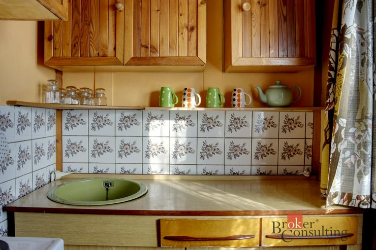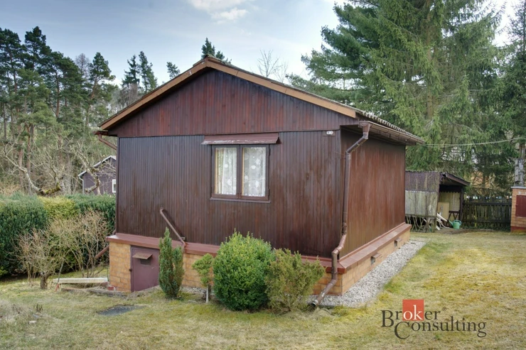Chata má užitnou plochu cca 38 m² a praktickou dispozici 2 pokoje + kuchyňka. Stavba je postavená na zděných základech, je částečně podsklepená a má sedlovou střechu, což zajišťuje stabilitu i dobré využití prostoru.