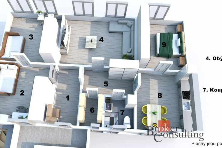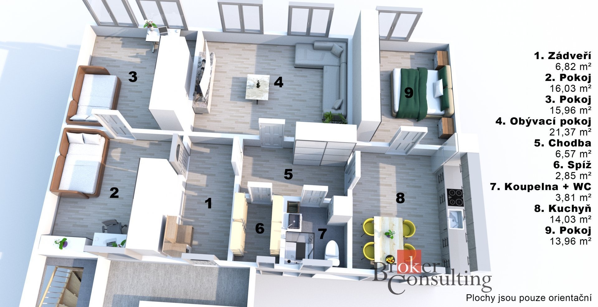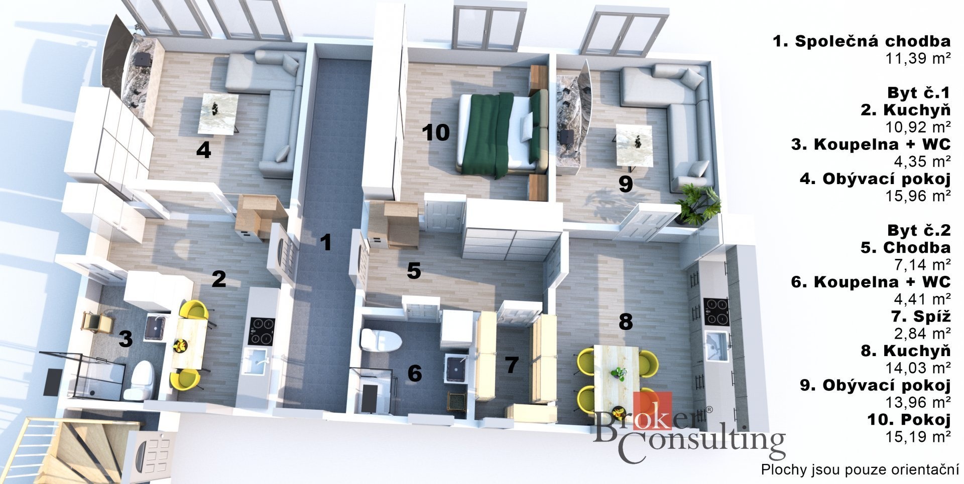 Uvedené výměry jsou orientační. Veškeré zveřejněné údaje mají pouze informativní charakter a nepředstavují nabídku ve smyslu § 1731 nebo § 1732 občanského zákoníku, ani veřejný příslib dle § 1733 občanského zákoníku.