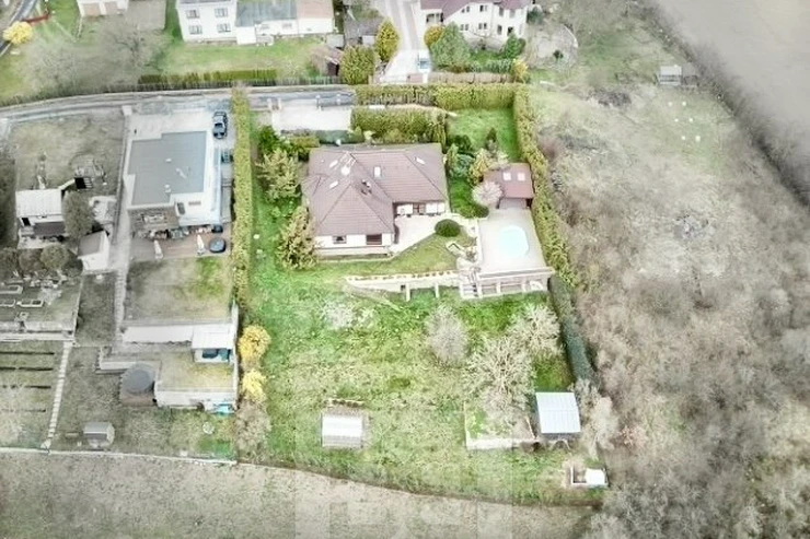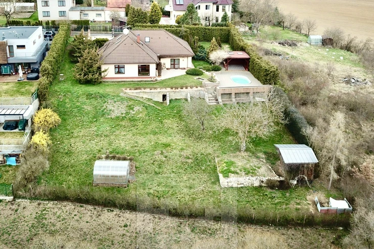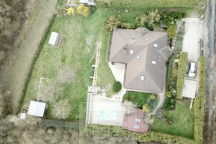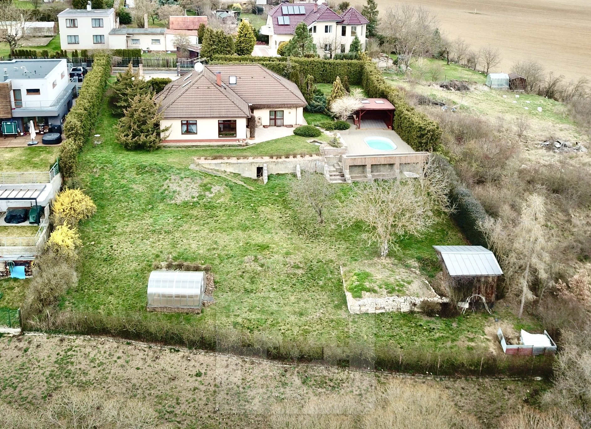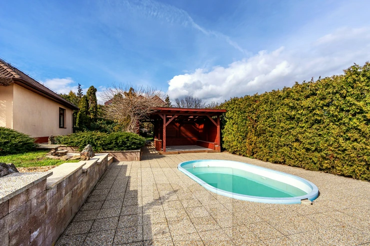 Next to the house, there is a covered pergola (45 sqm) with a built-in oval swimming pool (5 × 3.5 m). In the lower part of the garden, there is also a greenhouse (4 × 3 m) and a garden shed.