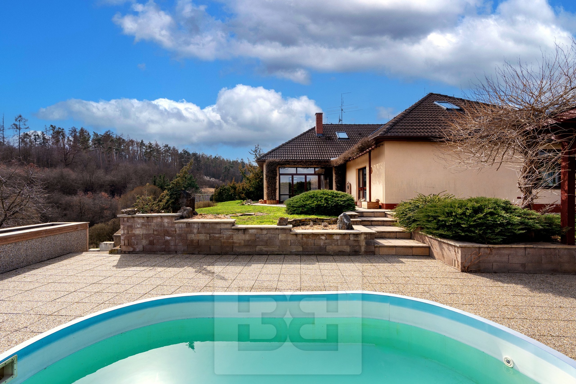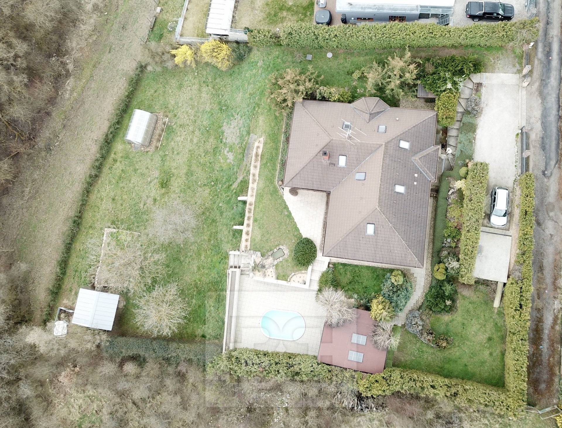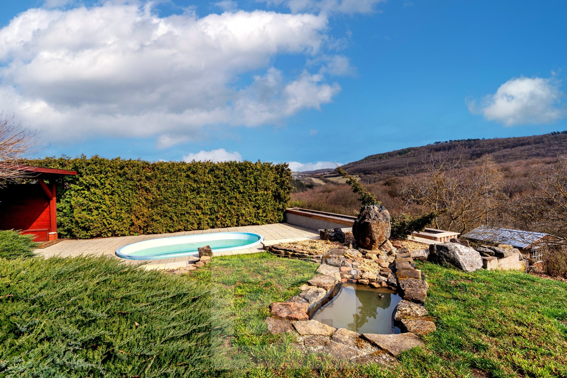 Next to the house, there is a covered pergola (45 sqm) with a built-in oval swimming pool (5 × 3.5 m). In the lower part of the garden, there is also a greenhouse (4 × 3 m) and a garden shed.