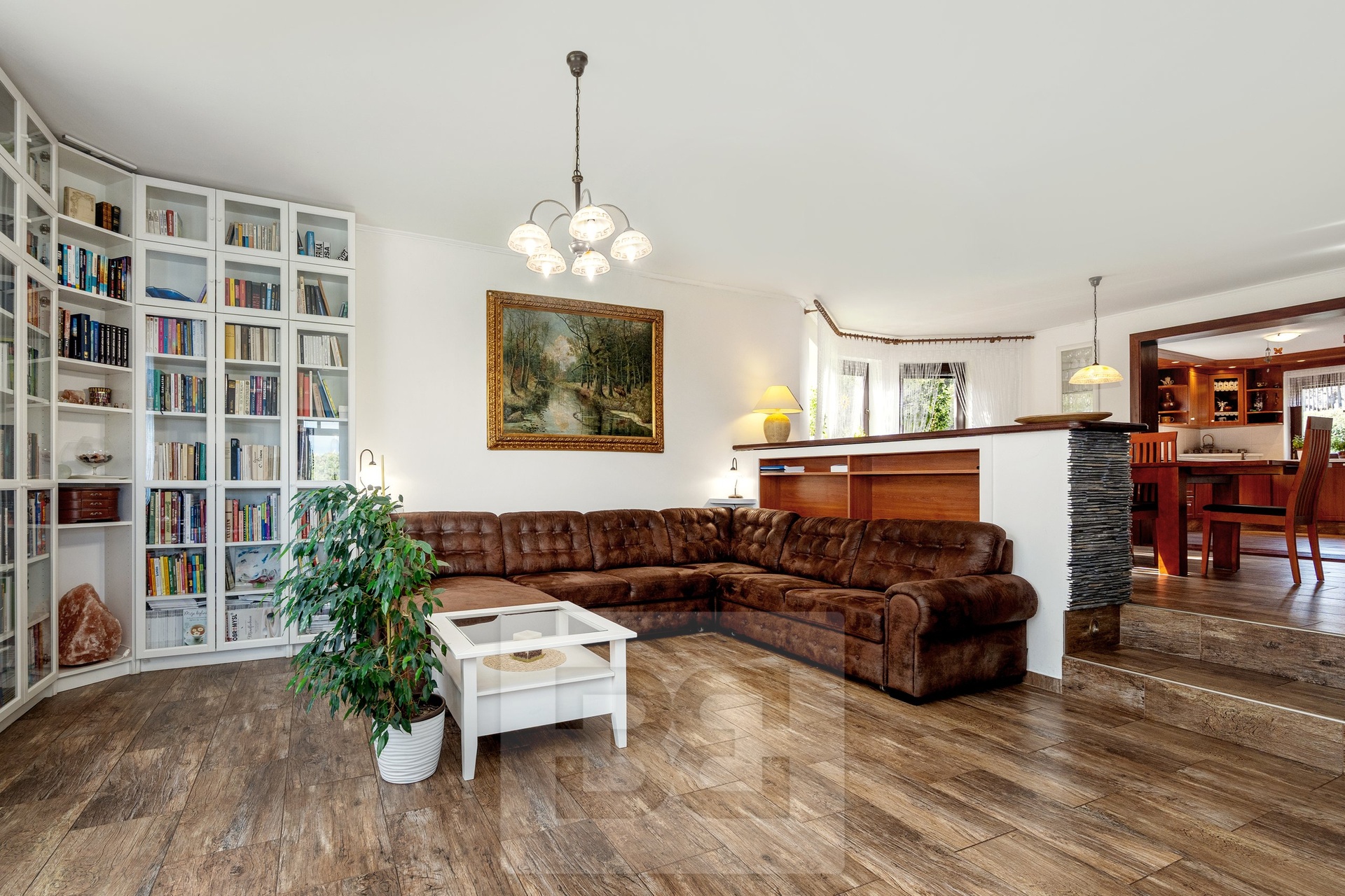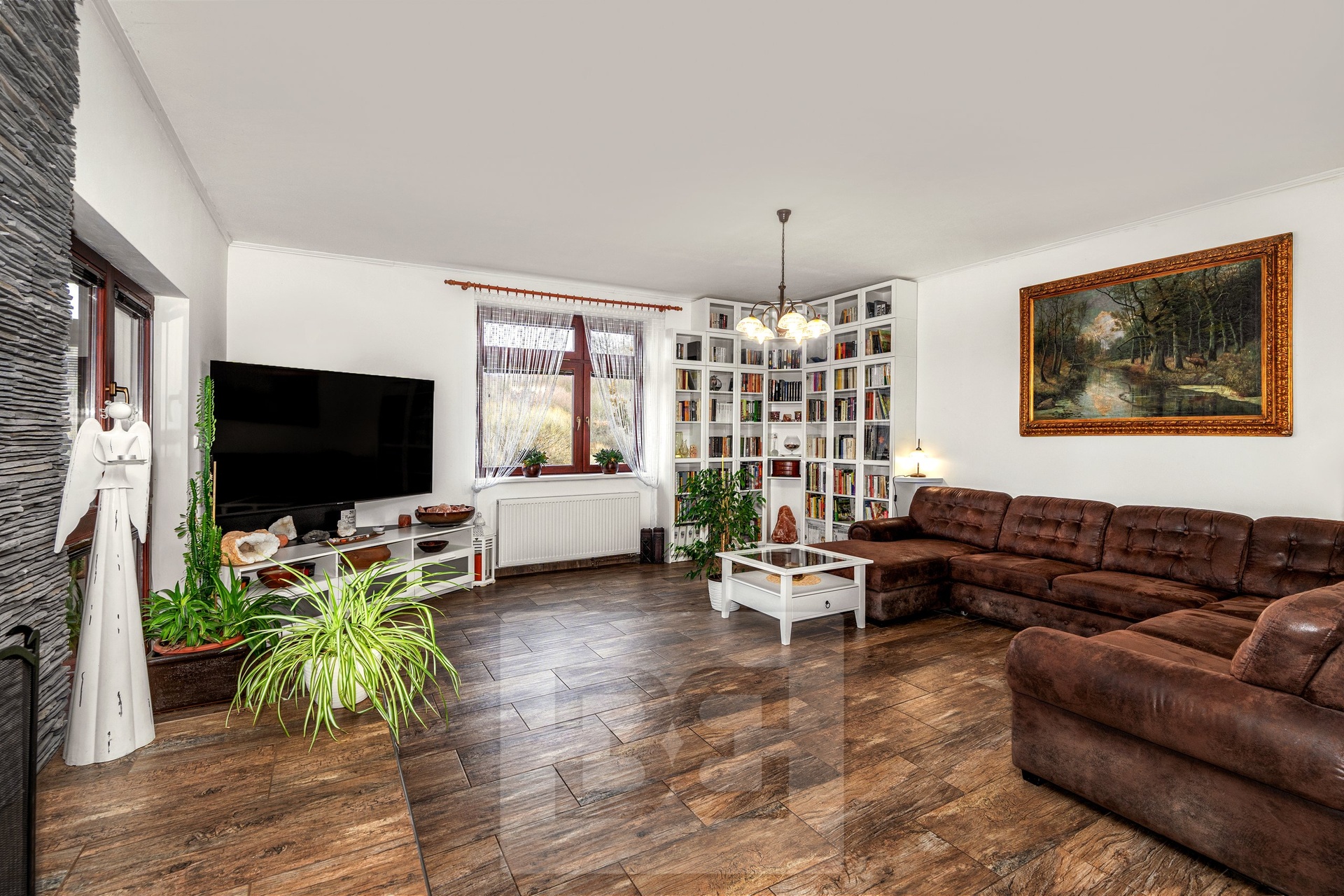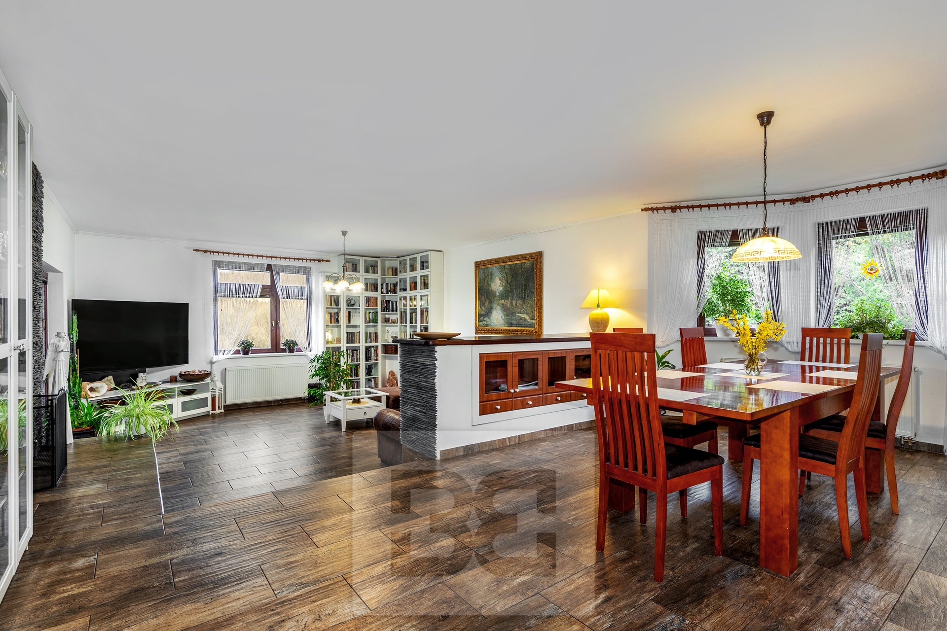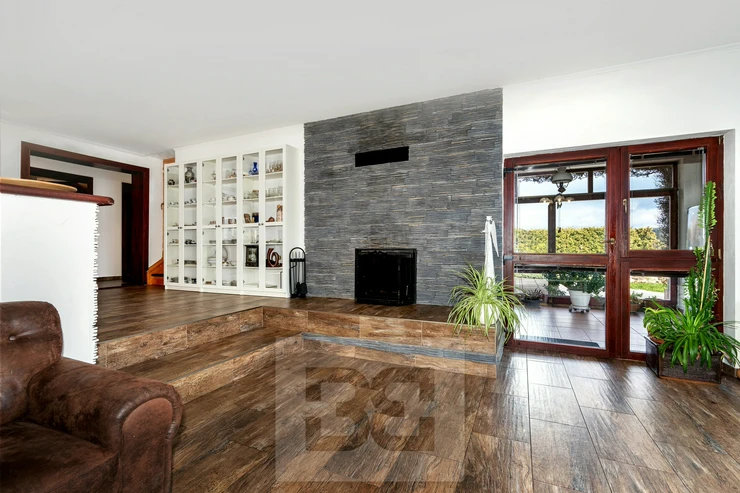 Upon entering the house, you are welcomed by an entrance hall, from which there is access to a spacious kitchen with built-in appliances and a practical pantry. The kitchen is connected to the living room, where a fireplace with a heat exchanger forms the centerpiece. The fireplace is serviced from the rear side through a winter garden, which also provides direct access to the main garden.