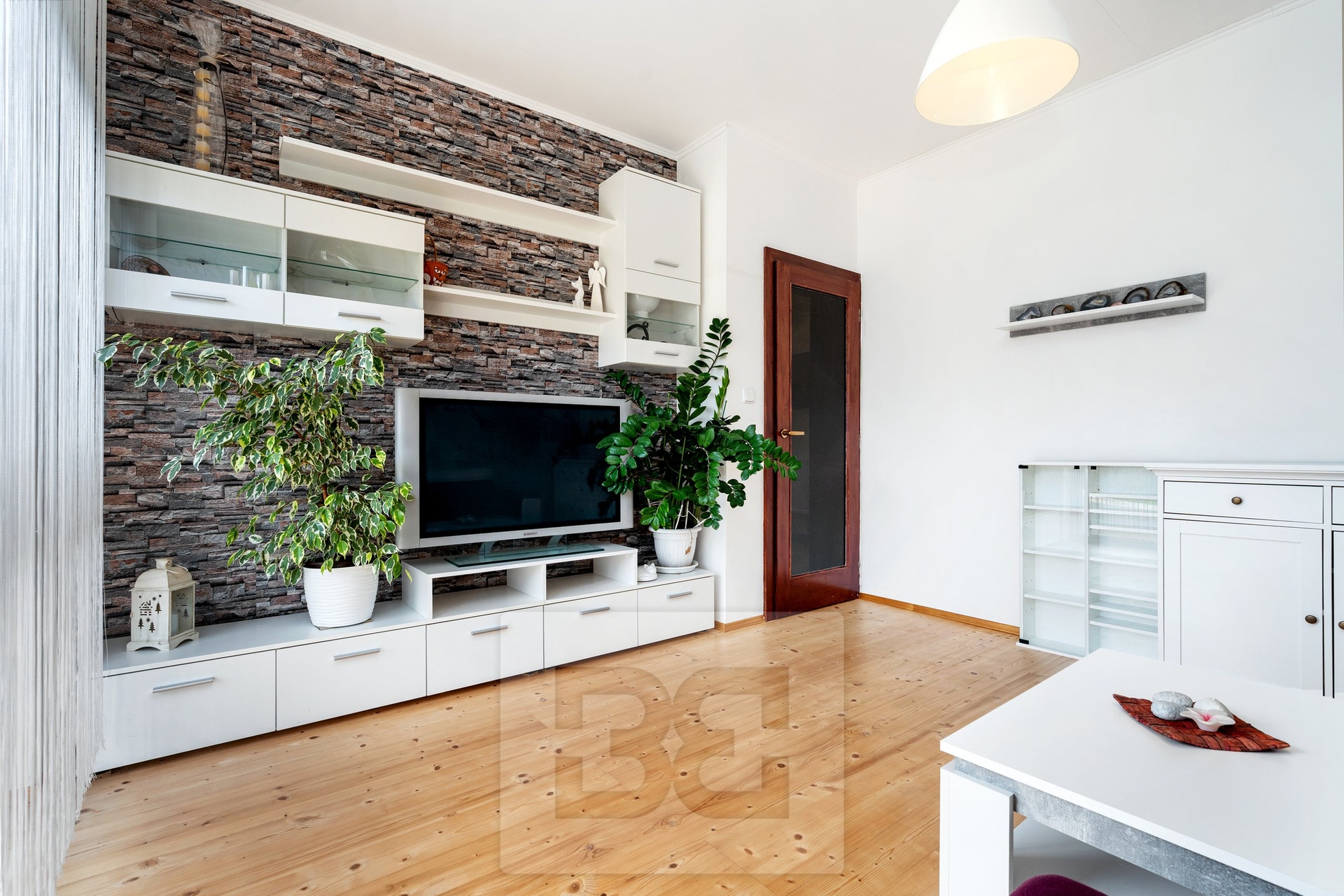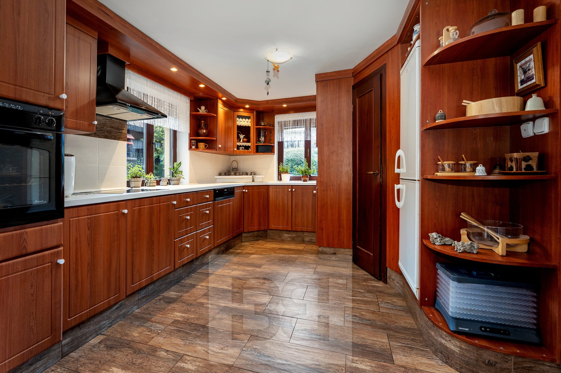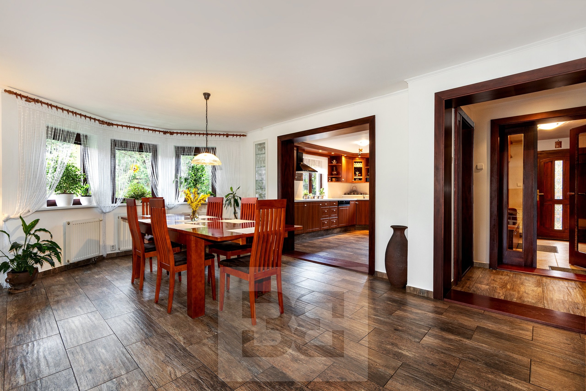 Upon entering the house, you are welcomed by an entrance hall, from which there is access to a spacious kitchen with built-in appliances and a practical pantry. The kitchen is connected to the living room, where a fireplace with a heat exchanger forms the centerpiece. The fireplace is serviced from the rear side through a winter garden, which also provides direct access to the main garden.