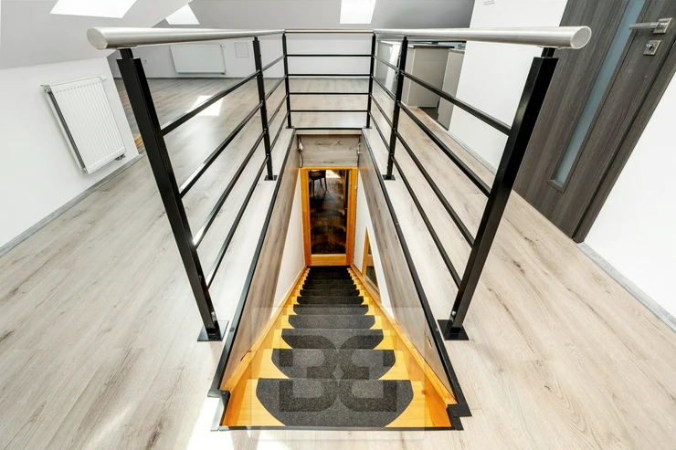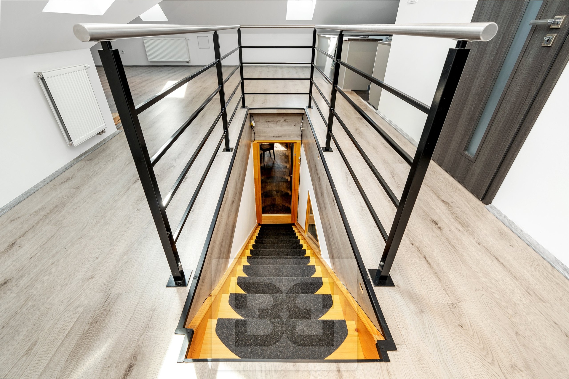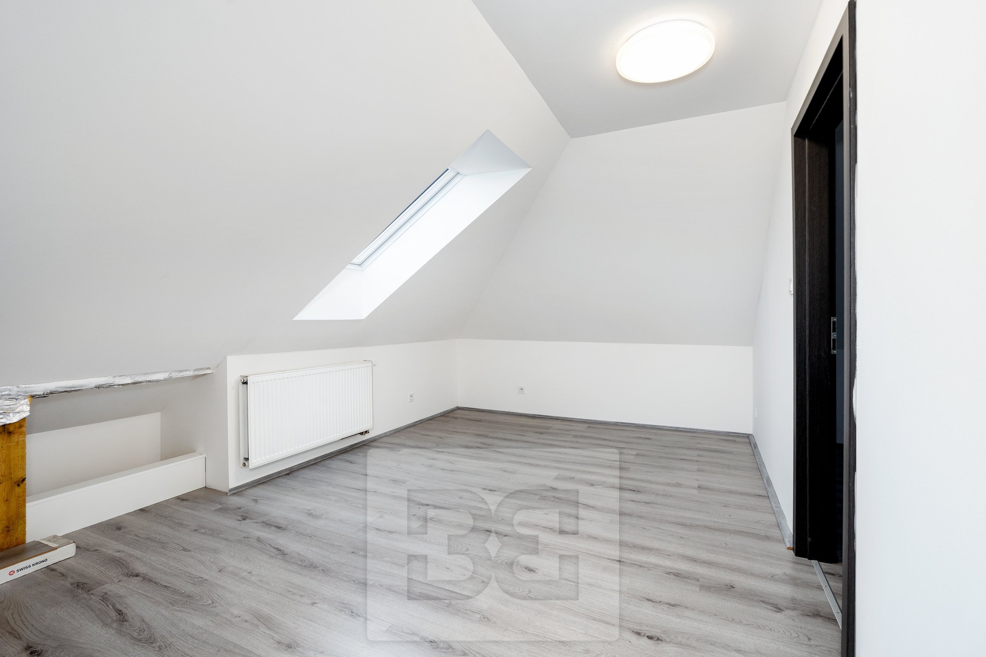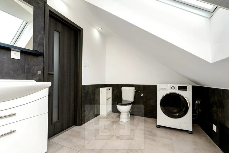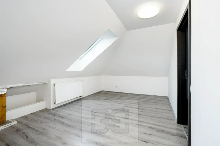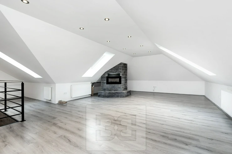 A wooden staircase leads to the upper floor, which was newly built in 2020 (including new windows, insulation, etc.). This level includes a bedroom, a large living room with a bio-fireplace, a bathroom with a bathtub and toilet, and a kitchen. The layout allows for multi-generational living or use as a separate unit, for example as a home office.