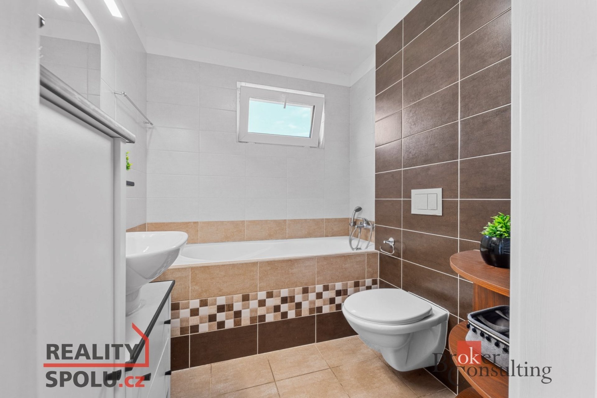 V patře jsou dva pokoje, druhá koupelna a přístup do půdního prostoru, který slouží jako praktický úložný prostor.
