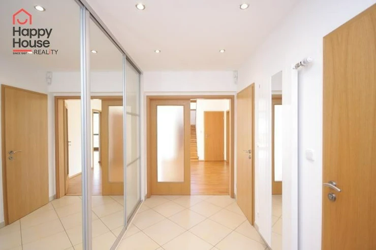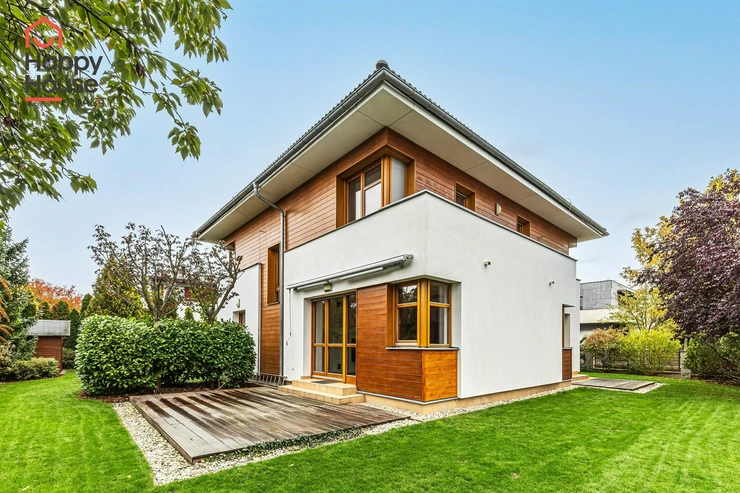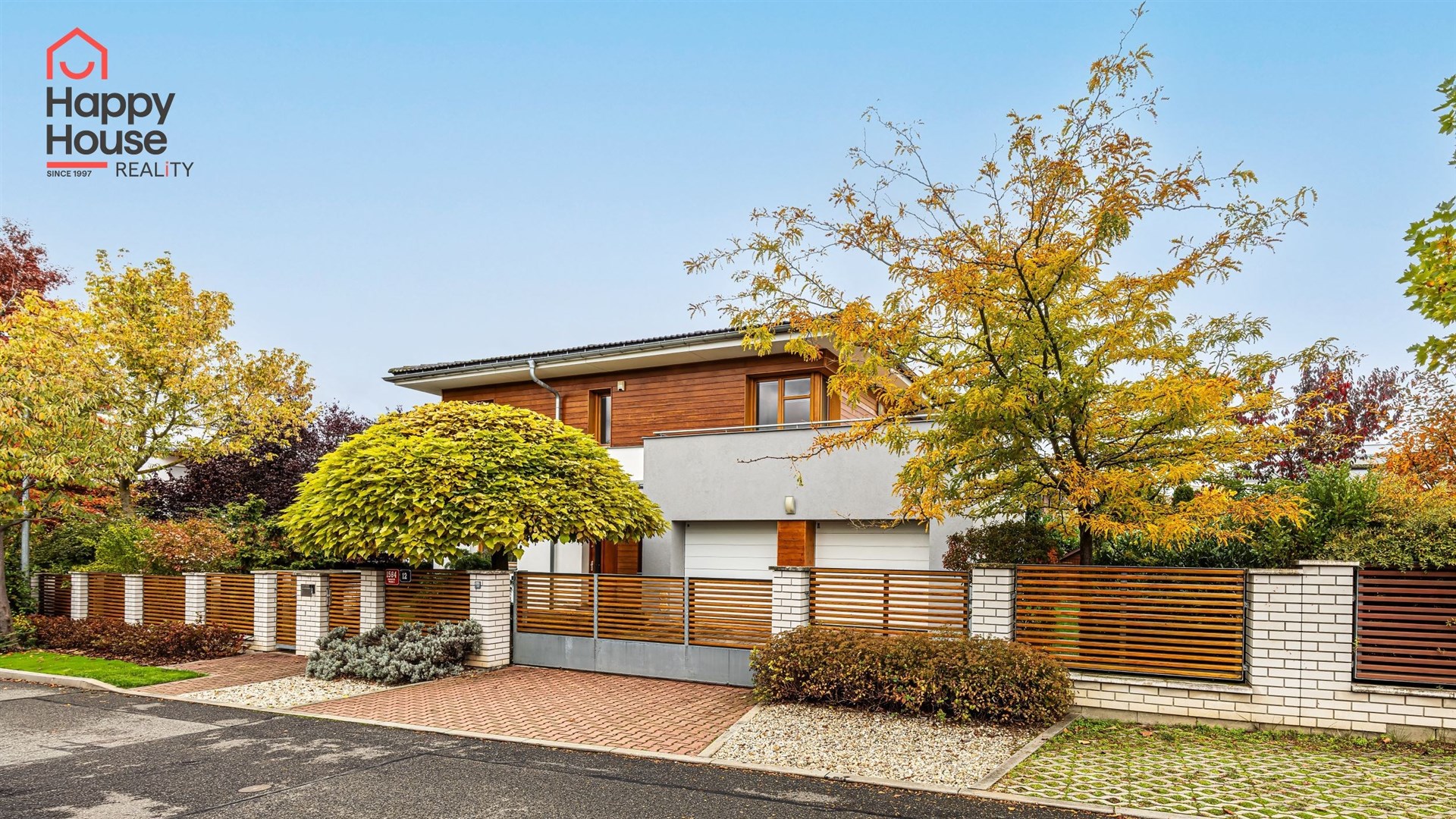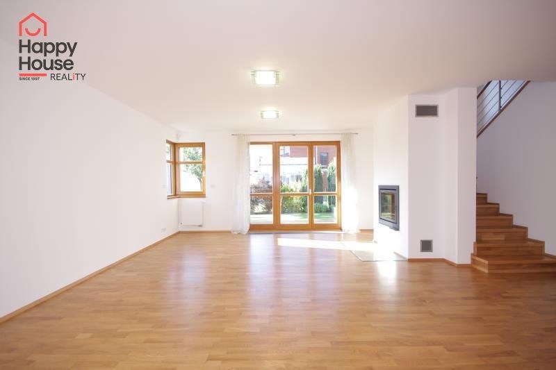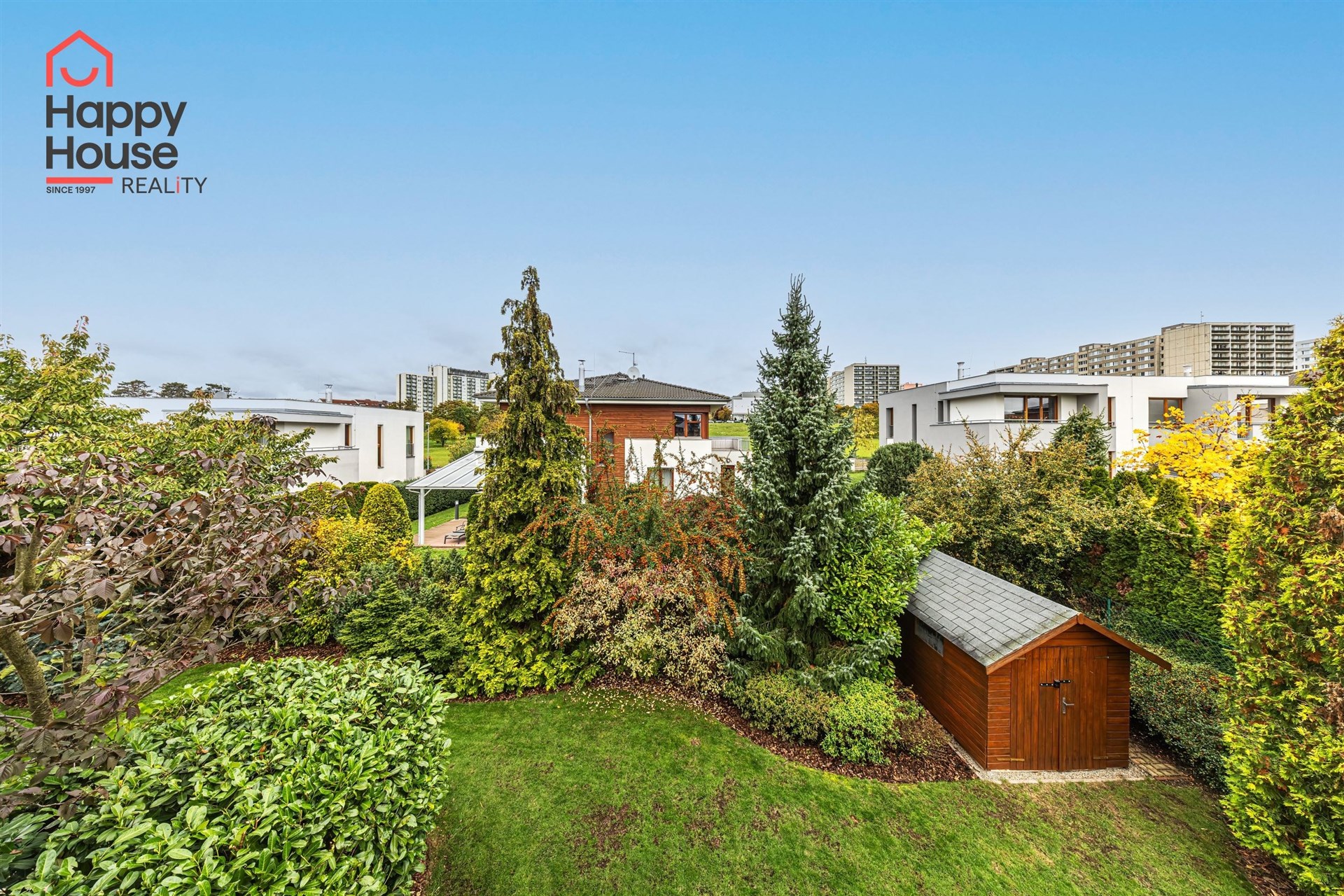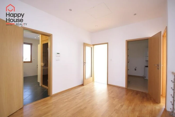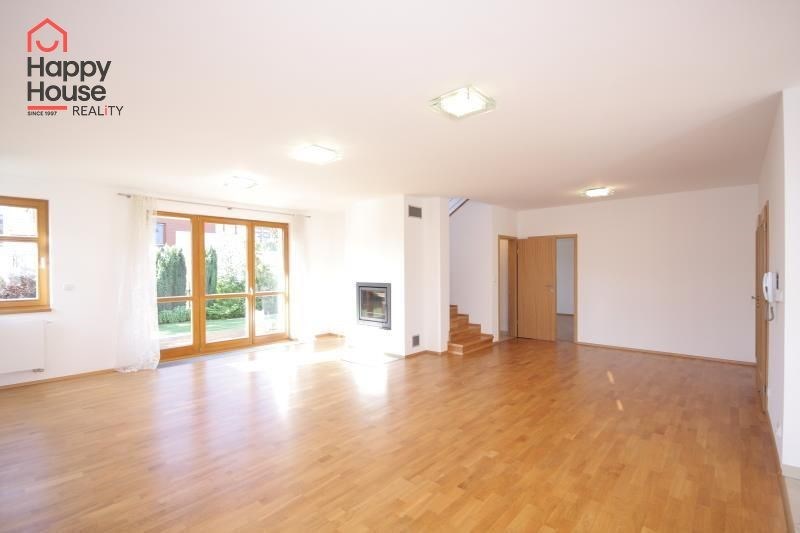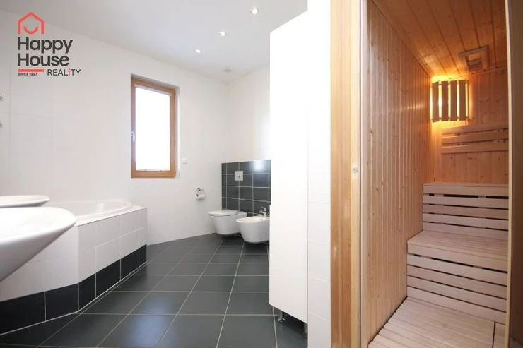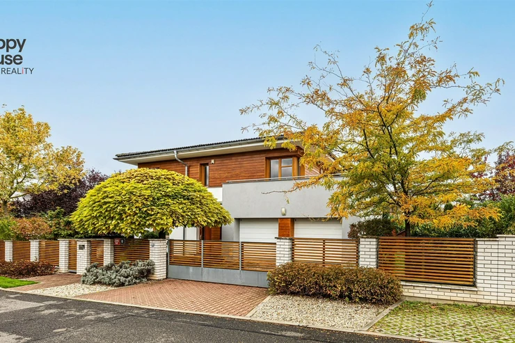 We exclusively offer for sale a beautiful, detached, five-bedroom family house with a layout 6+kítchenette located in Kunratice area, Prague 4, featuring a larger garden, three terraces, balcony, sauna and a fireplace. The total area of the house is 272,5 sqm, with one terrace (20 sqm) on the ground floor in front of the living room, the second terrace (7,4 sqm) in front of the kitchen, both made of exotic bangkirai wood, and the third terrace (24,8 sqm) on the first floor with paving facing southeast. There is also a balcony (7.2 sqm) on the 1st floor oriented to the west. The living floor area of the house is 197.4 sqm, of which the ground floor offers 94.3 sqm and the upper floor 103.1 sqm (excluding balcony, terrace, staircase and double garage). There is a spacious living room with a fireplace. The kitchen unit comes with built-in appliances. The property has 5 bedrooms in total - one on the ground floor and four on the first floor, 3 bathrooms, 1 separate toilet, an entrance hall, a hallway on the first floor, 2 storage rooms, and a utility room. A garage (39,8 sqm) for 2 cars is included. New wooden floors in the living room, all bedrooms, and the first-floor hallway with wooden floors as well, while other rooms have tiled floors. The main bathroom includes a Finnish sauna. The kitchen and bathrooms have heated floors. Satellite TV wiring is installed. There is a built-in wardrobe in the entrance hall. Another large built-in wardrobe in the master bedroom. The house is heated by a gas boiler and protected by a security alarm. Security blinds are installed on the windows. The beautifully maintained garden covers approximately 574 sqm and includes automatic irrigation system, a garden shed for tools, and garden furniture.