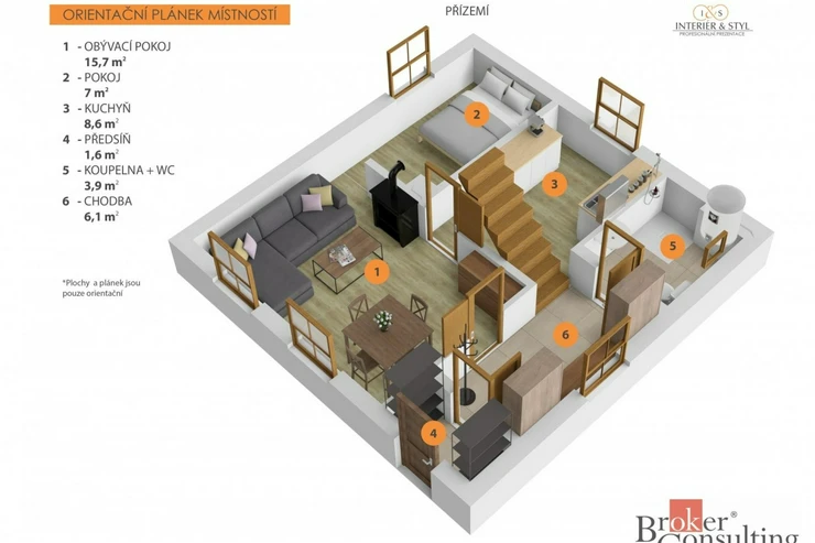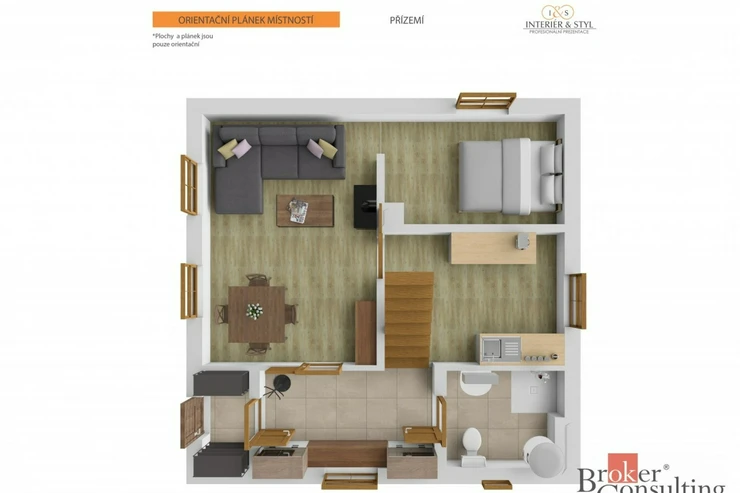 V přízemí se nachází vstupní chodba, prostorný obývací pokoj, kuchyň, ložnice a koupelna s WC.