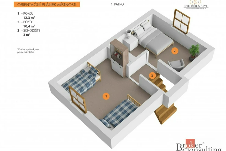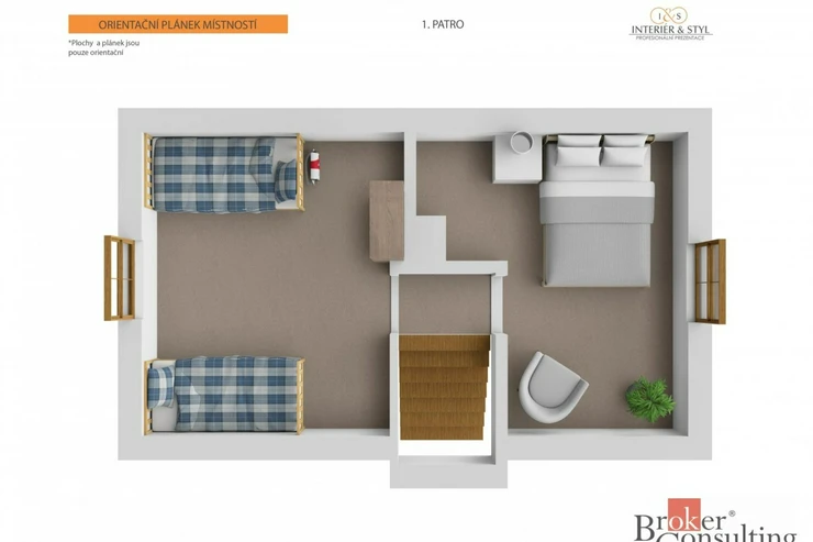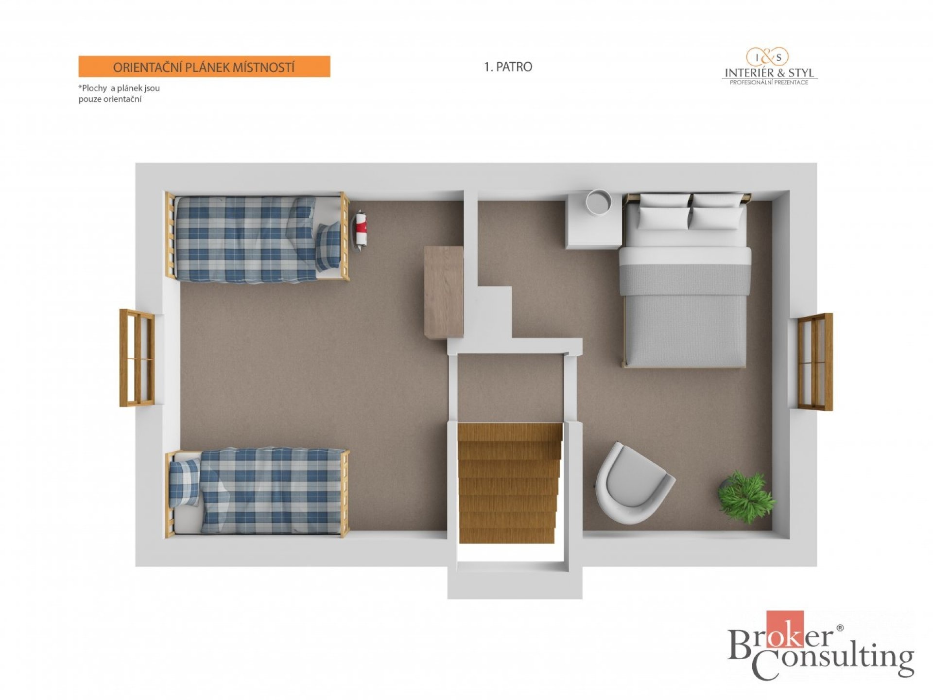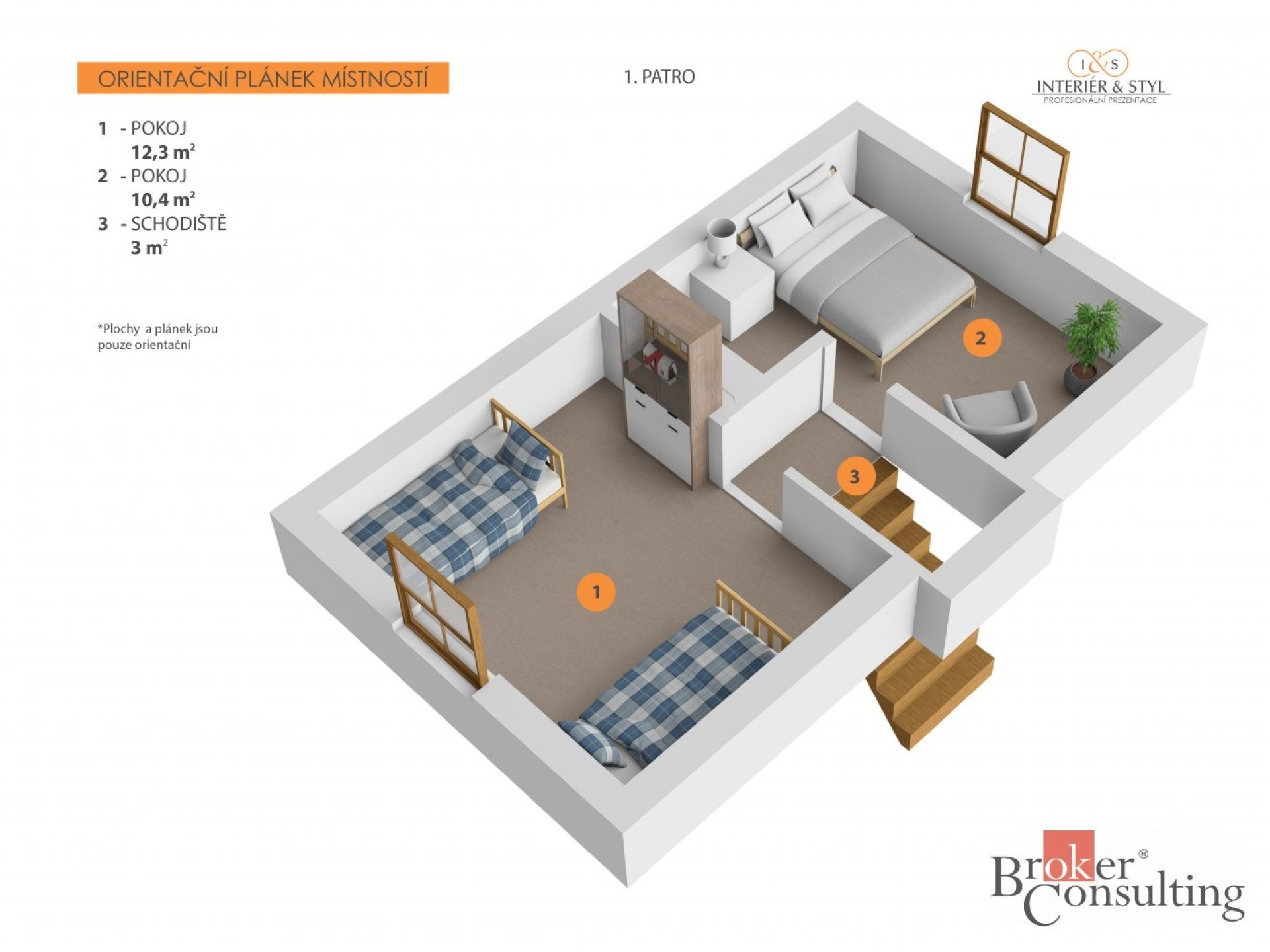 V patře najdete dva samostatné pokoje, ideální pro rodinu nebo hosty.