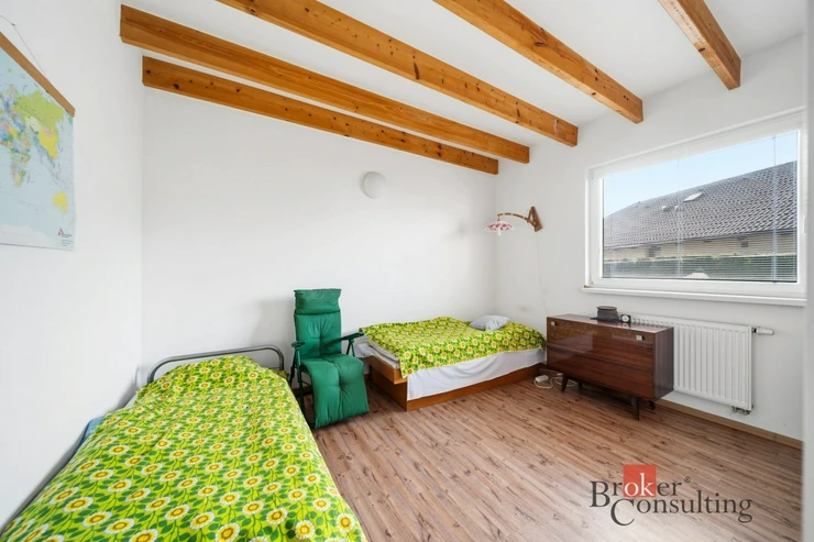 Jedná se o dřevostavbu se dvěma nadzemními podlažími, která nabízí prakticky řešený prostor a dostatek místa pro každodenní život. Dominantou domu je obývací pokoj s kuchyňským koutem a přímým vstupem na terasu orientovanou na jih, což zajišťuje dostatek světla po celý den. V přízemí domu se dále nachází 2 pokoje, koupelna, samostatné wc, šatna a technická místnost. V patře je jeden velký pokoj, který lze dispozičně upravit a šatna.