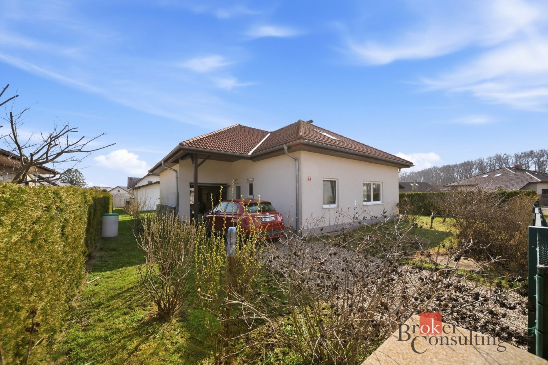 Součástí nemovitosti je garáž pro jedno auto a udržovaná zahrada se zahradním domkem, který poskytuje další úložný prostor.