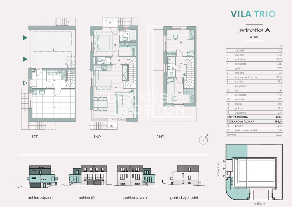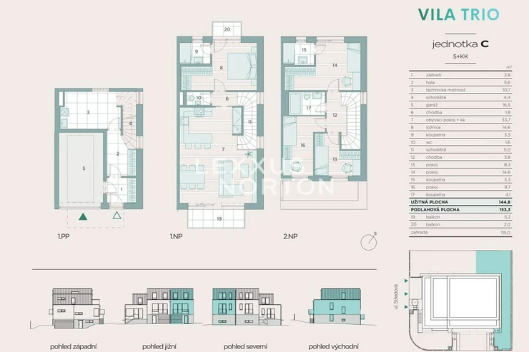 The new boutique project Vila Trio Strasnice presents a truly exceptional opportunity—the chance to acquire a prestigious urban villa with a usable area of approximately 492 sqm, a 263 sqm garden, and 3 garage spaces.The architecture draws inspiration from the elegant style of English townhouses, and combining units A, B, and C creates a unique whole that meets the demands of even the most discerning clients.Versatile Use – Living or InvestmentThe property offers exceptional flexibility of use:– Spacious Family LivingIdeal as a prestigious villa for a multigenerational family with ample privacy and shared space.– Corporate Headquarters with Residential FacilitiesThe perfect combination of business and living under one roof.– Investment opportunityPossibility of dividing into 3 separate residential units (A, B, C):– live in one– rent out the others– or hold the entire property as an income-generating asset– Custom layoutThe interior layout can be customized according to the buyer’s wishes, though this option is time-limited.Layout and SpaceEach unit is designed as a three-story house, and when connected, they form an exceptionally spacious whole:Ground Floor: entry hall, utility rooms, garages, officesMain Living Floor: spacious living room with kitchen and direct access to the terrace and gardenUpper Floor: bedrooms, children’s rooms / study, bathroomsThe complex offers ample space for both family life and prestigious use.The house meets the requirements for modern premium living:– large-format wood-aluminum windows with triple-pane glass– oak floors and Italian tile– high-quality designer fixtures– security entry door (Class 4)– heat pump + underfloor heating– heat recovery and air conditioning– pre-wiring for solar panels and exterior blindsAn attractive part of Prague with excellent accessibility:– Metro and tram within walking distance– City center within 15 minutes– Full range of amenities– Proximity to parks (e.g., Gutovka, Malesicky Park)Strasnice has long been one of the most sought-after residential areas thanks to its combination of tranquility, green spaces, and excellent transportation links.This property is not your typical listing—it represents a unique combination of luxury living, flexibility, and investment potential.Whether you are looking for a family villa, a combination of residential and commercial space, or an income-generating property, Villa Trio Strasnice offers a tailor-made solution.