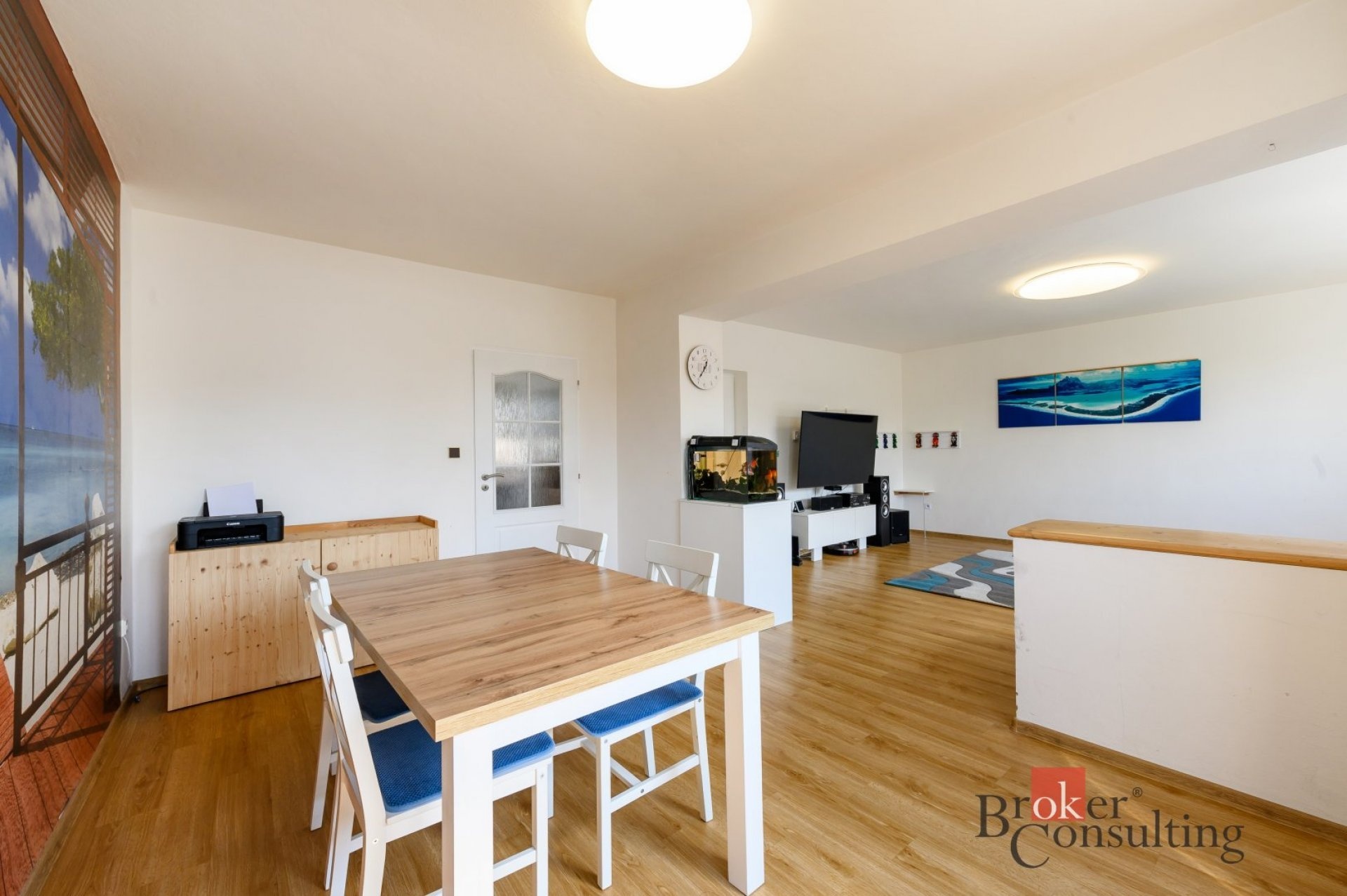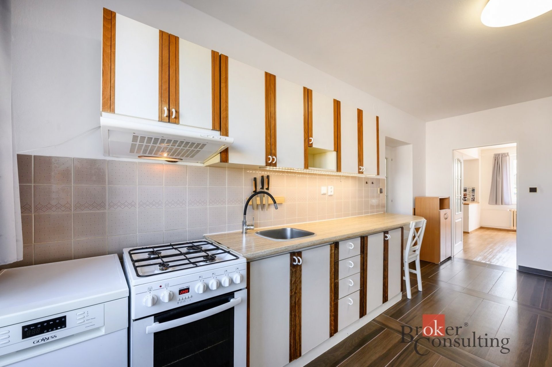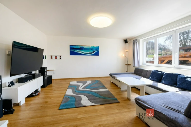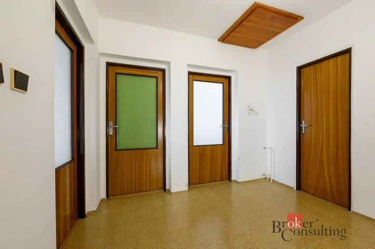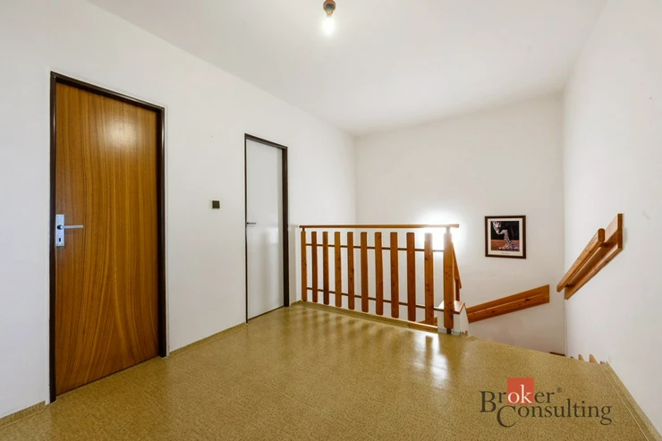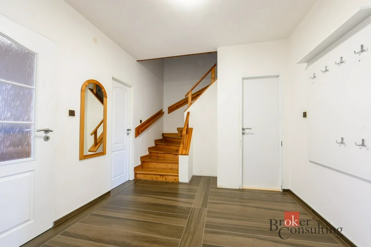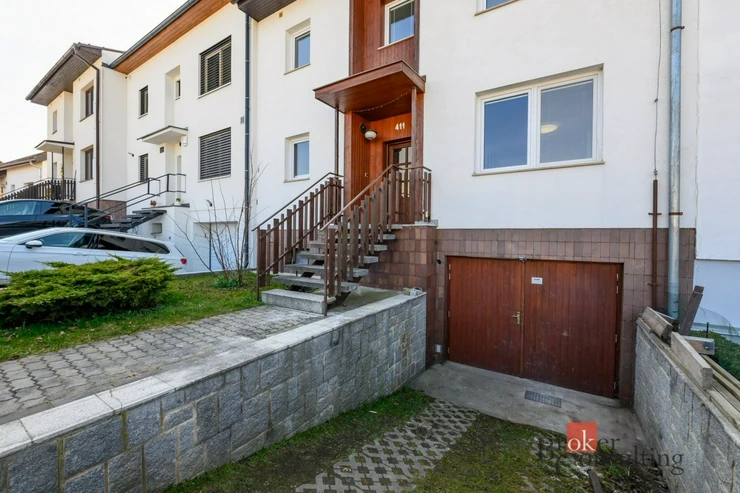 Dům je dvoupodlažní a nabízí praktickou dispozici se třemi ložnicemi, samostatnou kuchyní, jídelnou a prostorným obývacím pokojem. V obou patrech se nachází koupelna a WC. Nemovitost je kompletně podsklepená a její součástí je také garáž umístěná pod úrovní terénu.