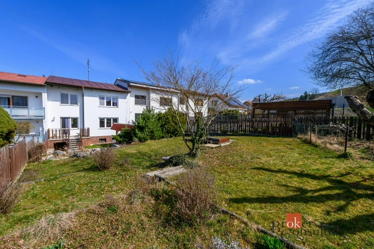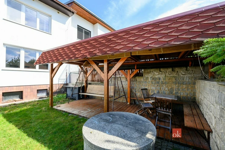 K domu náleží udržovaná zahrada s terasou a prostornou pergolou, ideální pro relaxaci, posezení s rodinou nebo přáteli.