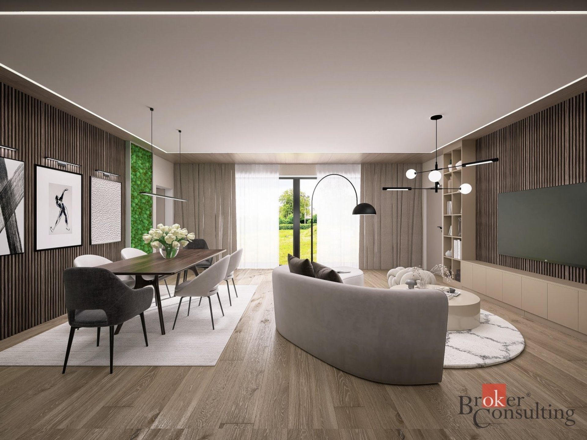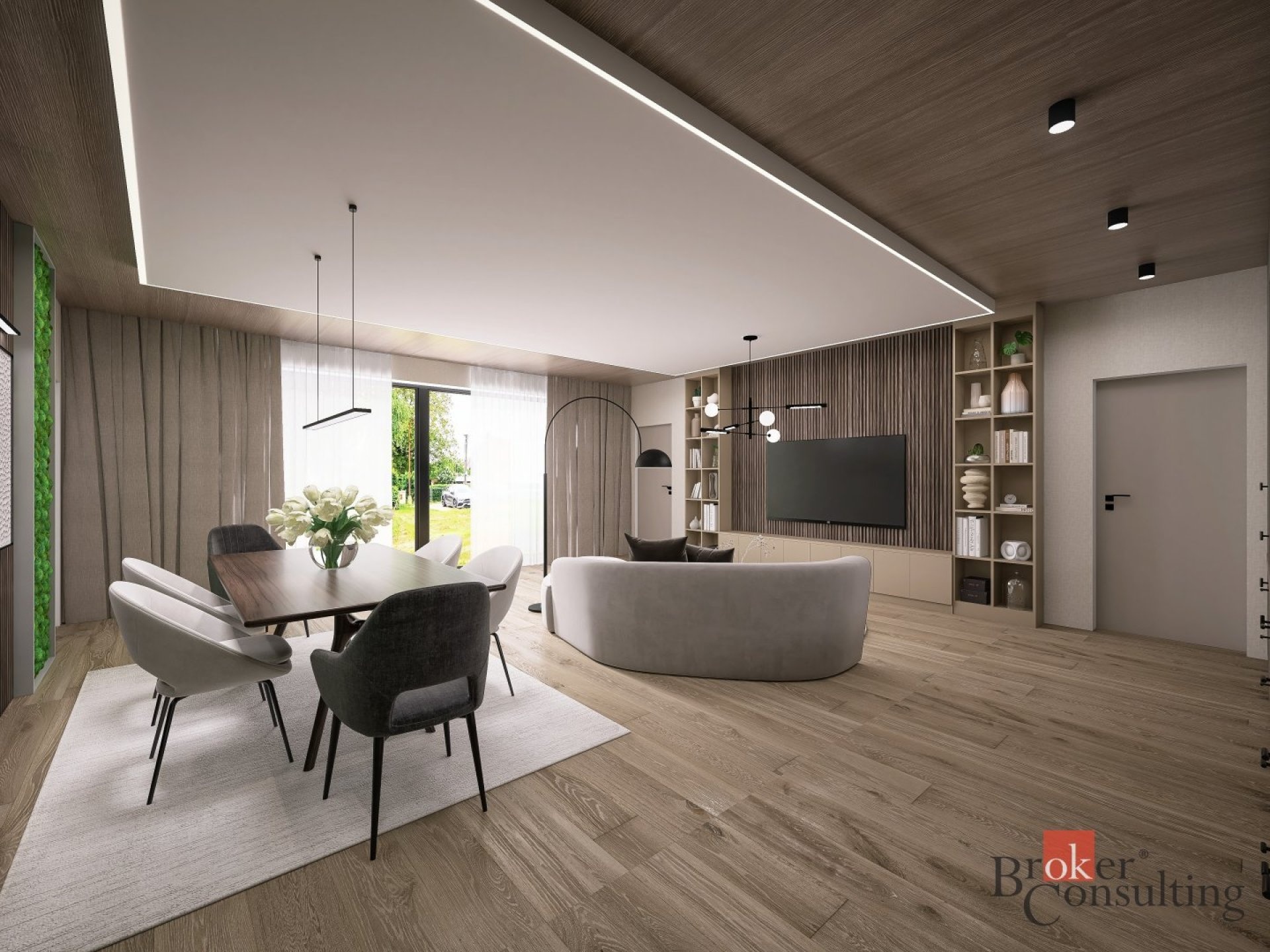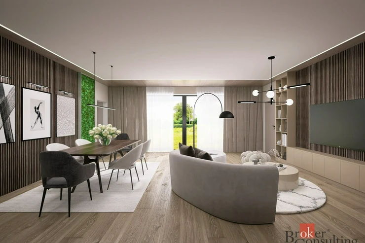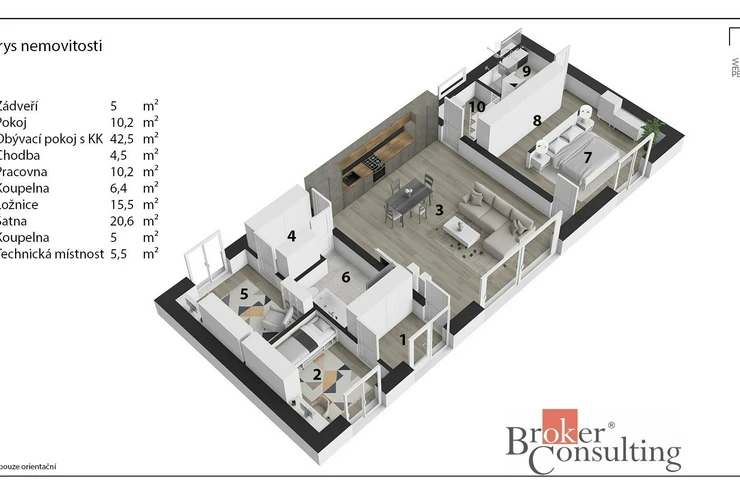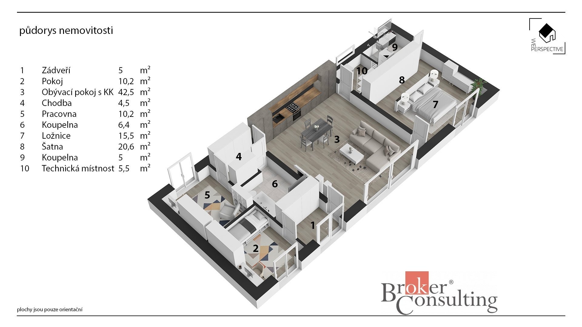 - prostorný obývací pokoj s kuchyňským koutem (42,5 m²) a vstupem do technické místnosti