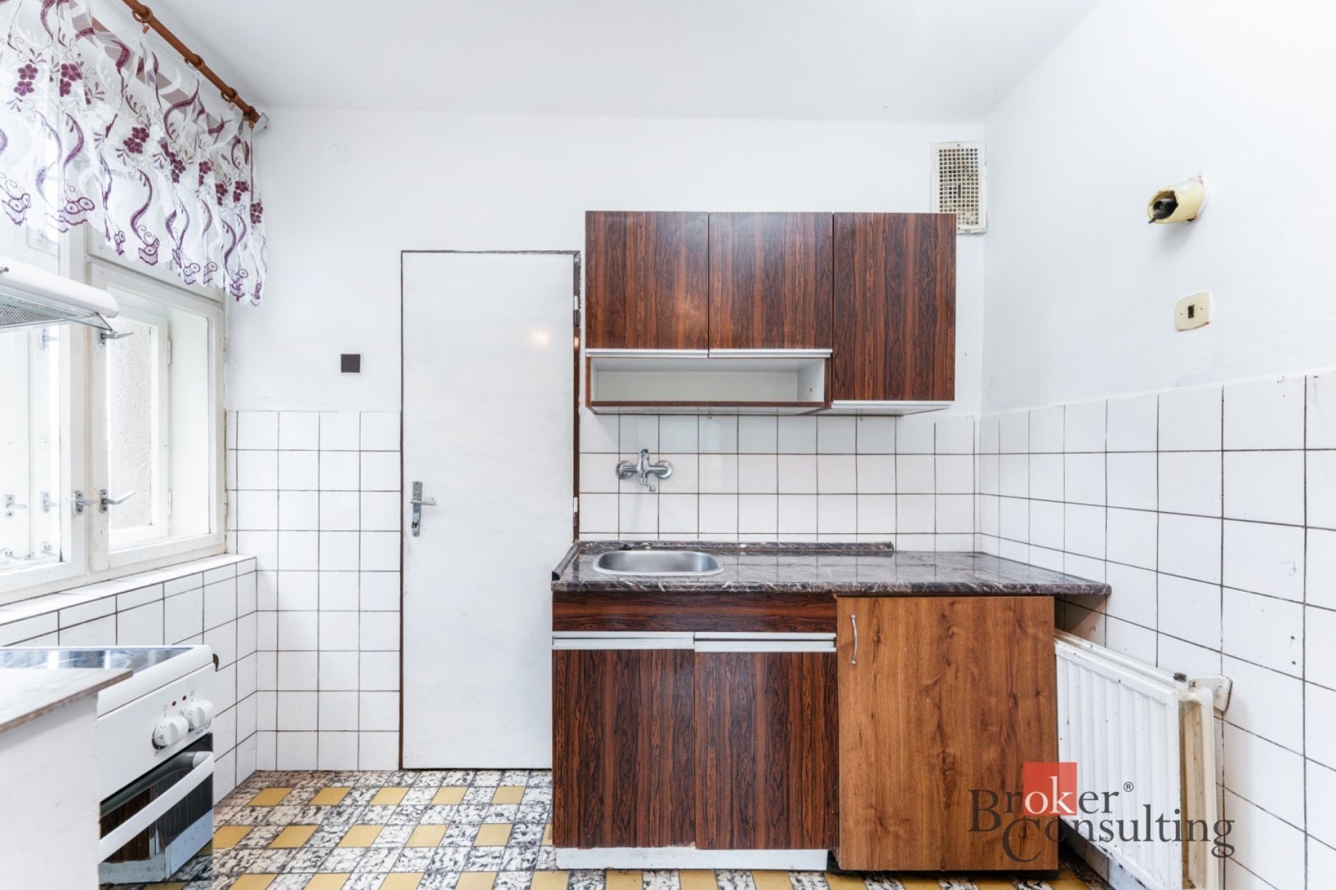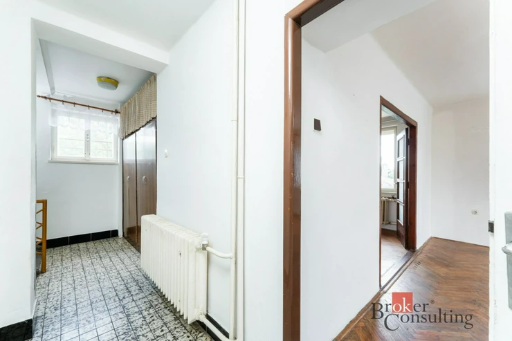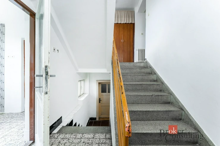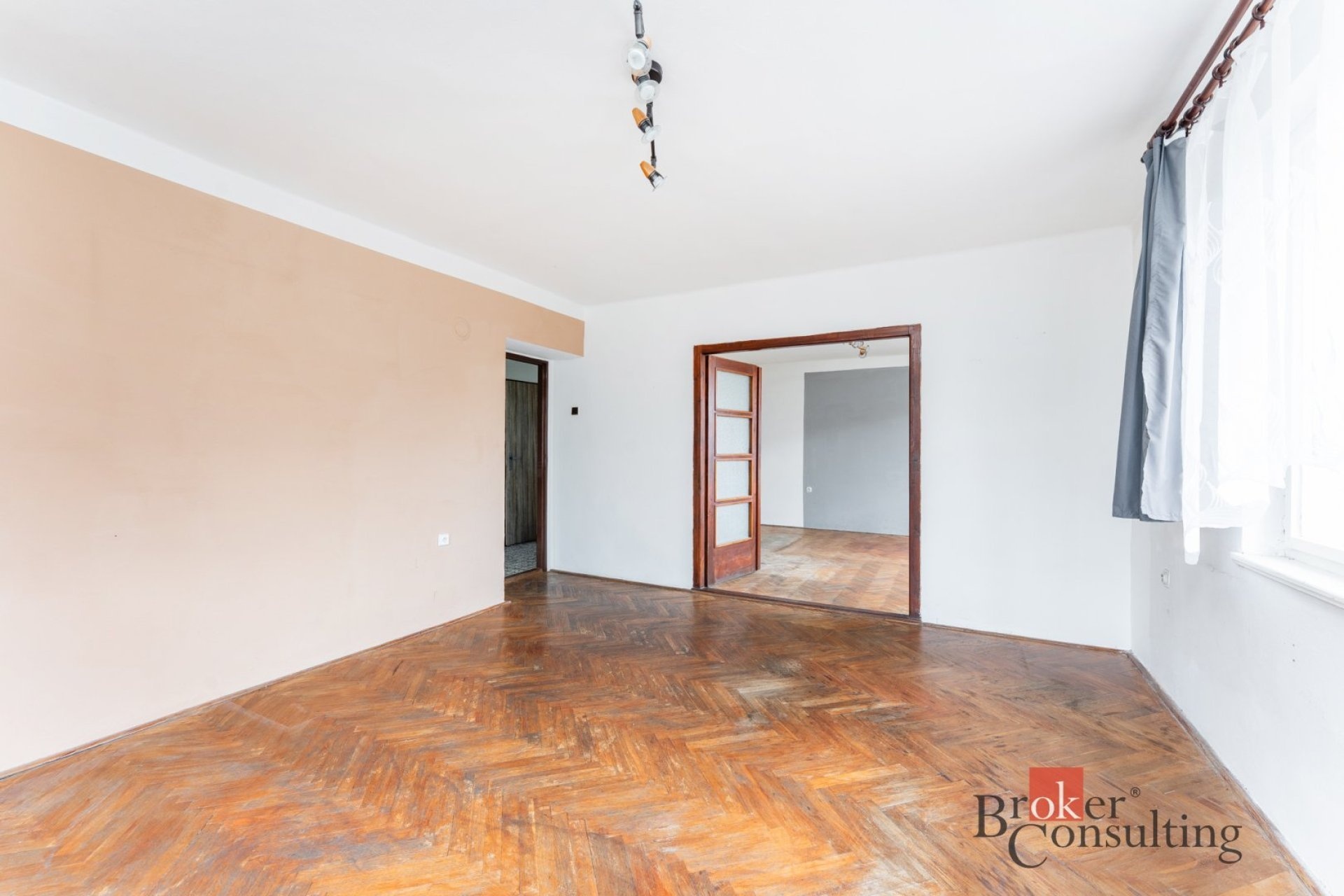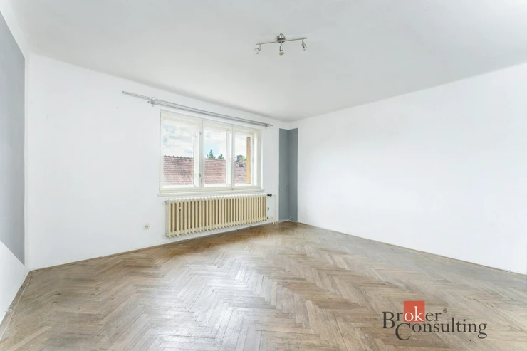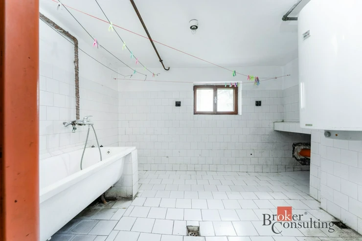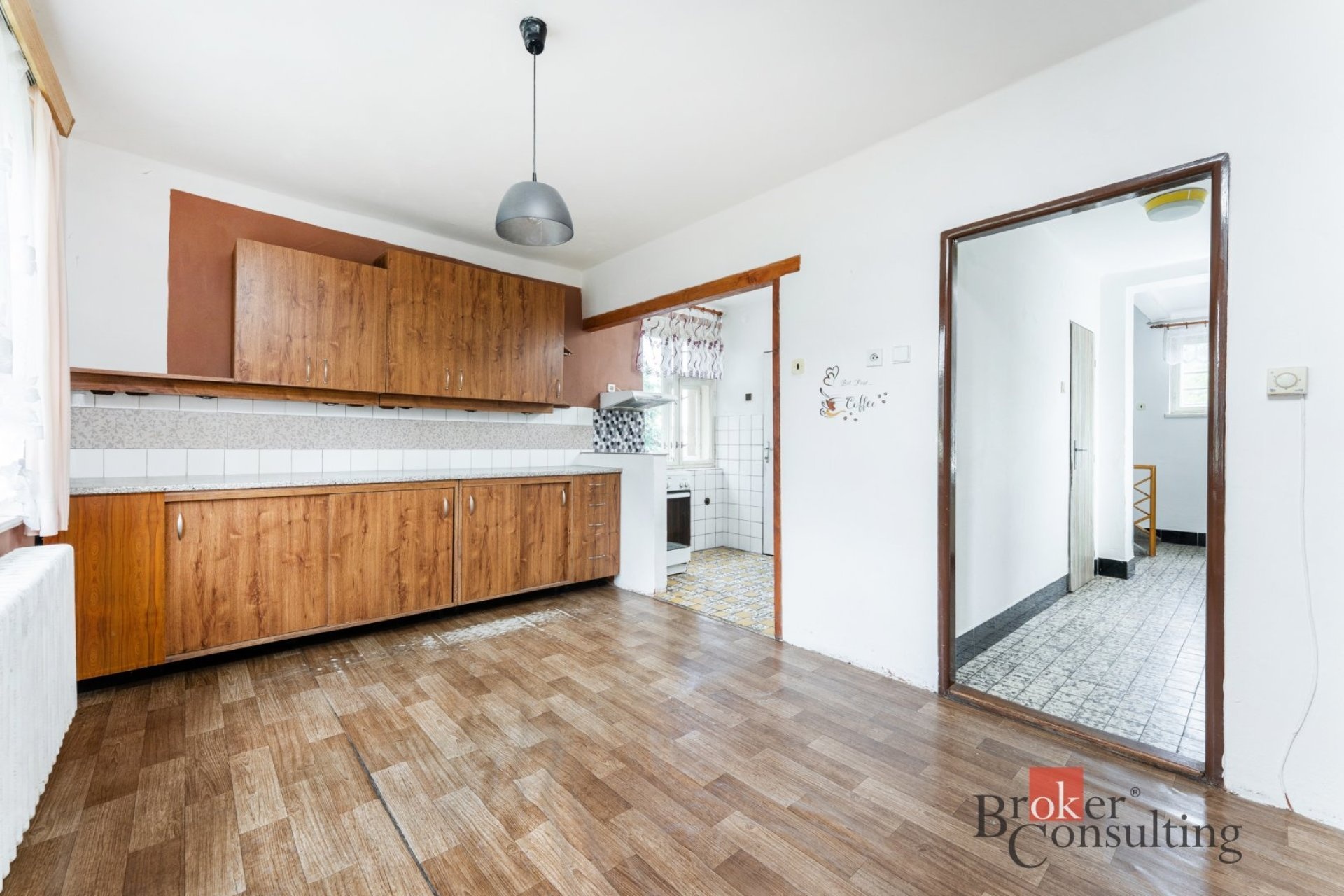 Dispozičně je dům velmi prakticky řešen. V suterénu se nachází prostorný sklep, který nabízí velkou kotelnu, prádelnu a dvě další místnosti vhodné například jako dílna, sklad nebo domácí fitness. Ve zvýšeném přízemí najdete modernizovanou koupelnu, prostornou kuchyň s jídelním koutem, jeden samostatný pokoj a další pokoj, který je průchozí přes velké dřevěné dveře do další místnosti. Tento otevřený prostor působí velmi světle a příjemně a je ideální jako obývací pokoj navazující na kuchyň.