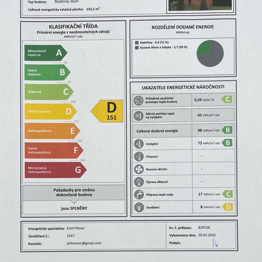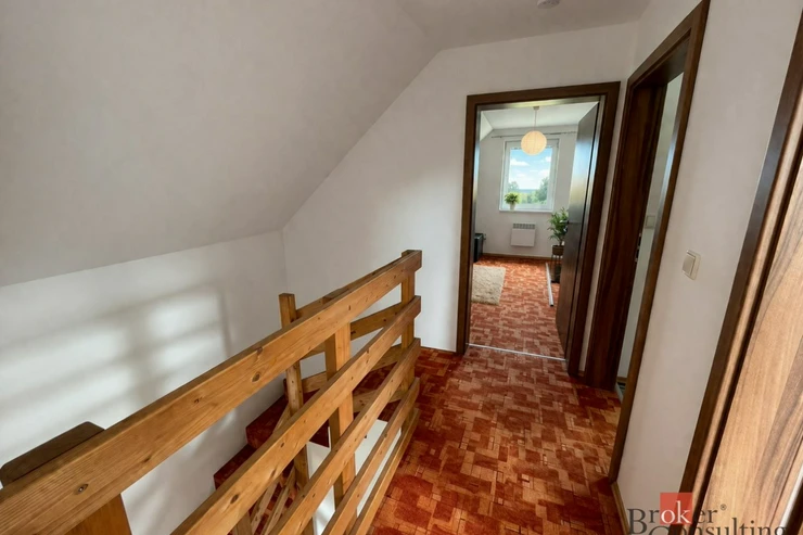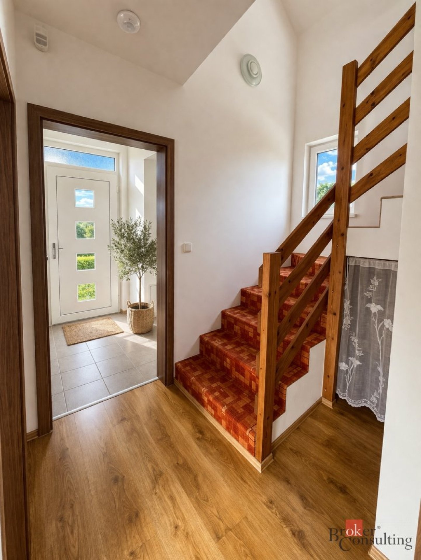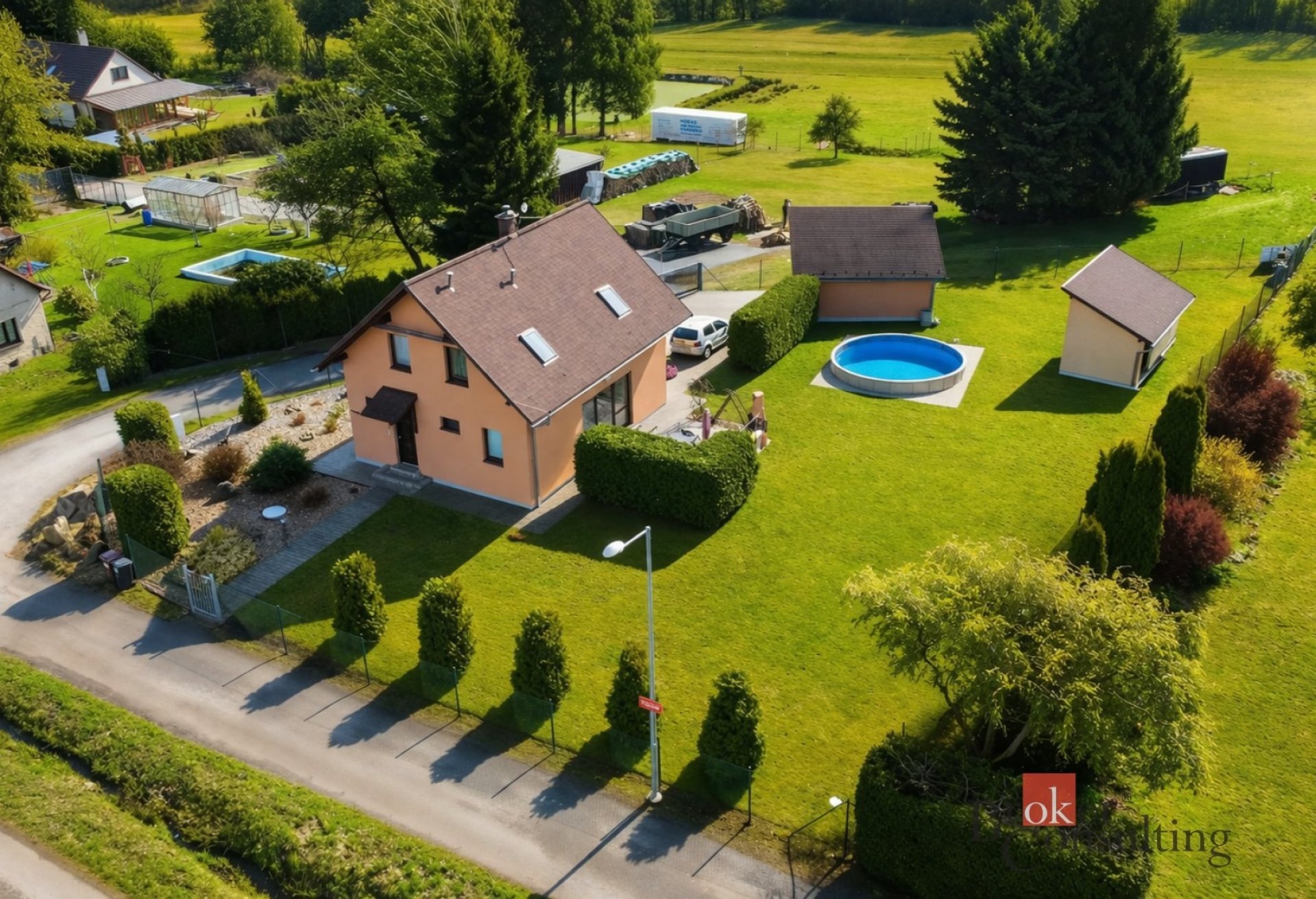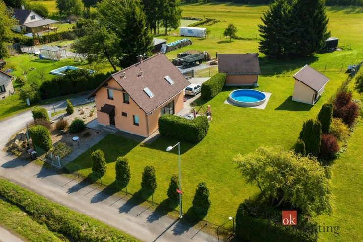 Dům je patrový o dispozici 5 + KK, s užitnou plochou přibližně 121 m². Díky svému uspořádání nabízí dostatek prostoru pro rodinný život, práci z domova i soukromí jednotlivých členů domácnosti. V přízemí je slunný obývací pokoj s navazující kuchyní a samostatný pokoj, dále pak koupelna s vanou a samostatné WC. V patře jsou k dispozici tři pokoje a koupelna se sprchovým koutem a druhým WC. Stavba je dřevěná, zateplená, dokončená v roce 2012 a je ve výborném technickém stavu, takže je možné se nastěhovat a ihned bydlet.