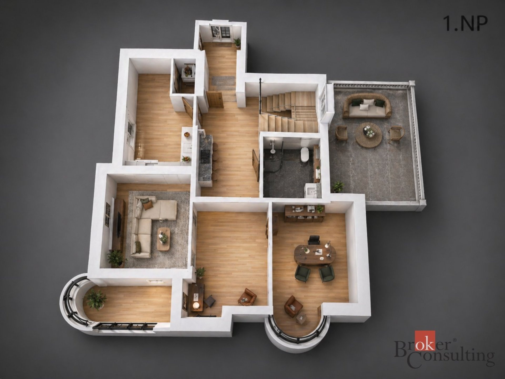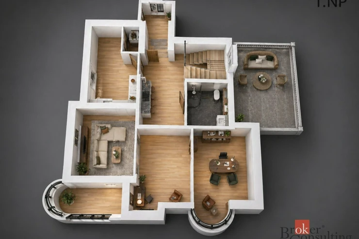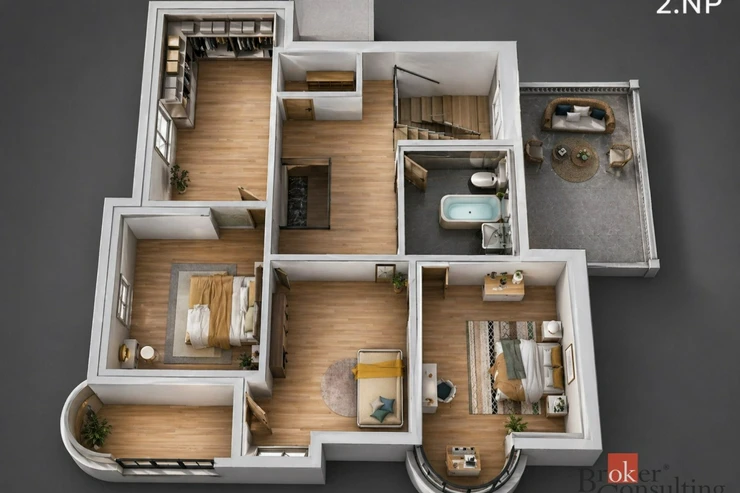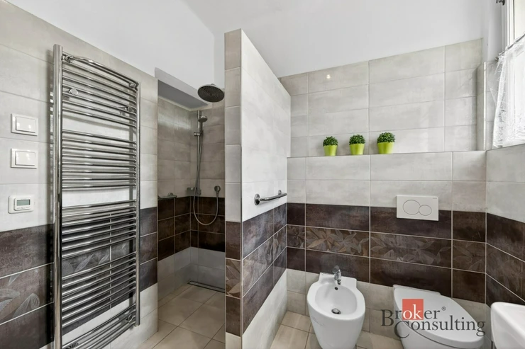 Dispozice domu je velmi velkorysá a rozložená do tří podlaží. V suterénu se nachází několik sklepních místností a technické zázemí o celkové ploše přes 75 m², což nabízí široké možnosti využití pro skladování, hobby zázemí, dílnu, domácí fitness nebo další doplňkové prostory. Hlavní obytné podlaží tvoří vstup, prostorná hala, koupelna se sprchovým koutem a toaletou, dva pokoje, kuchyň, spíž, schodiště a zimní zahrada, která dodává domu mimořádně příjemnou atmosféru. V patře se nachází další hala, koupelna s vanou, samostatné WC, ložnice, dva další pokoje, šatna a komora. Dům tak nabízí dostatek prostoru pro větší rodinu, vícegenerační bydlení i kombinaci bydlení a práce z domova.