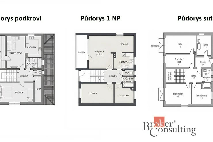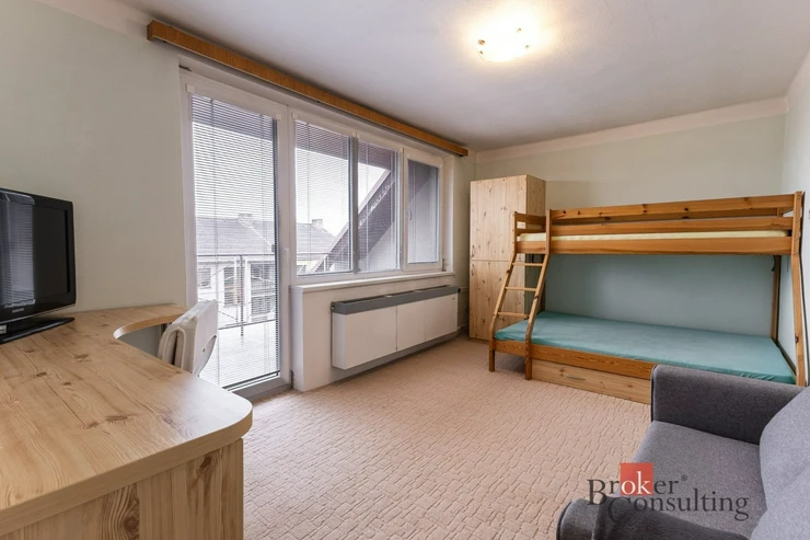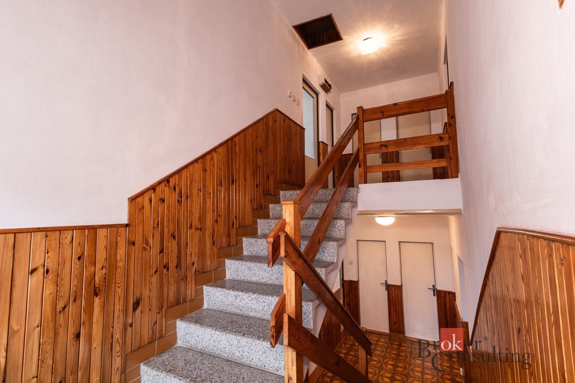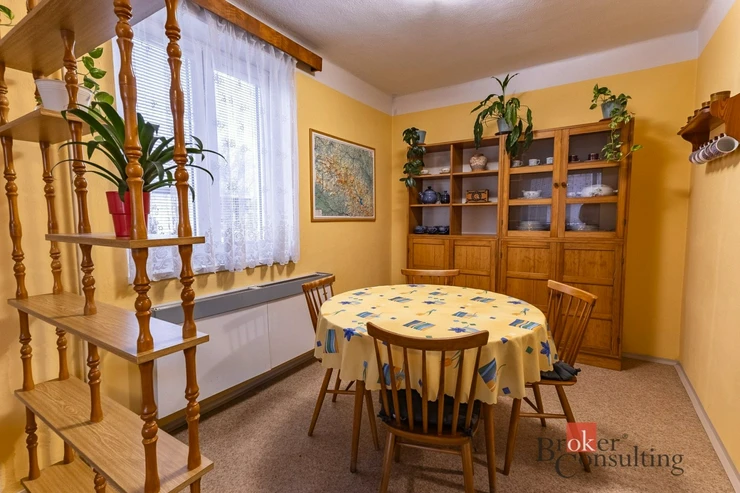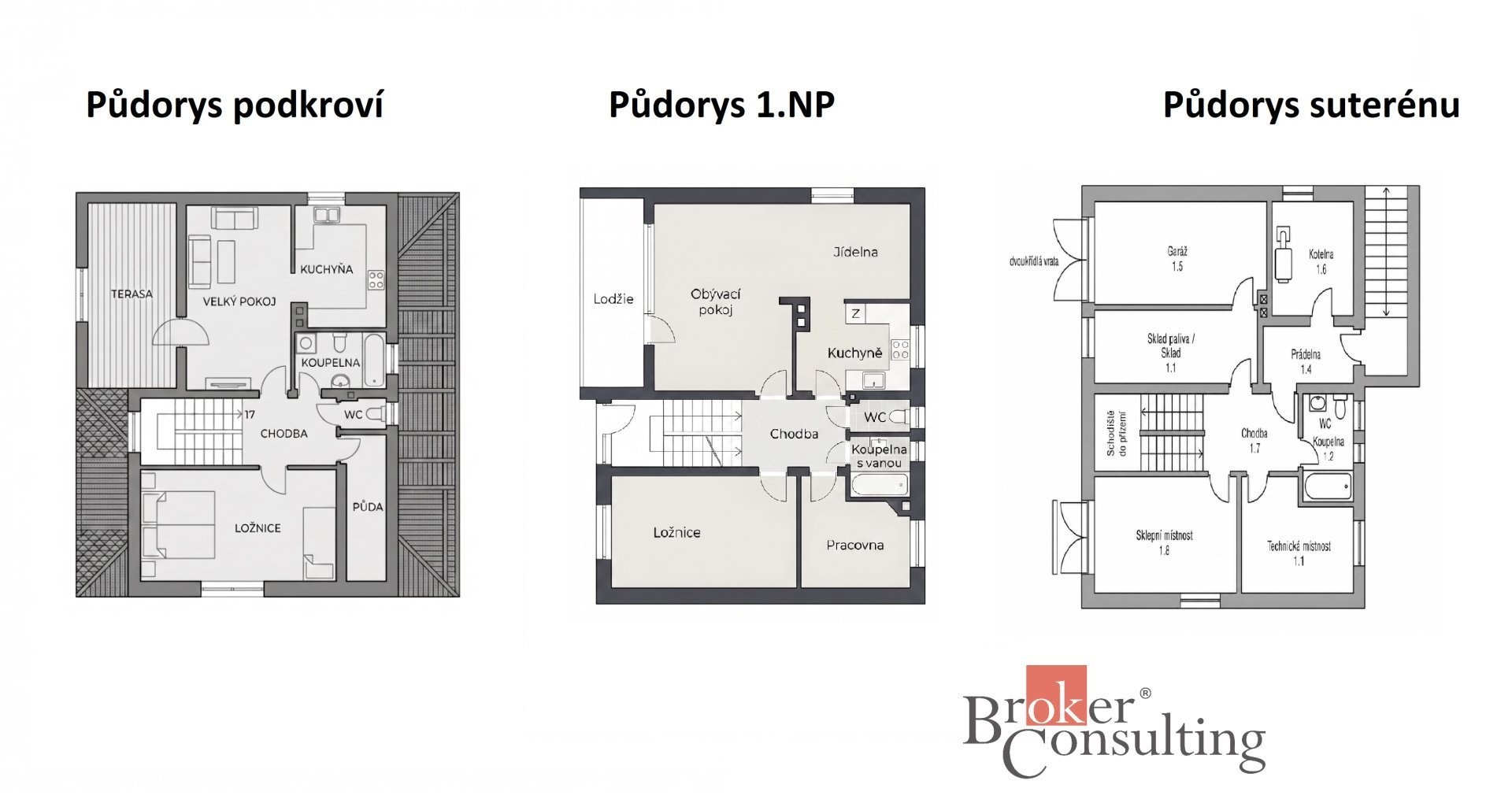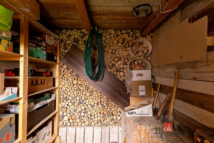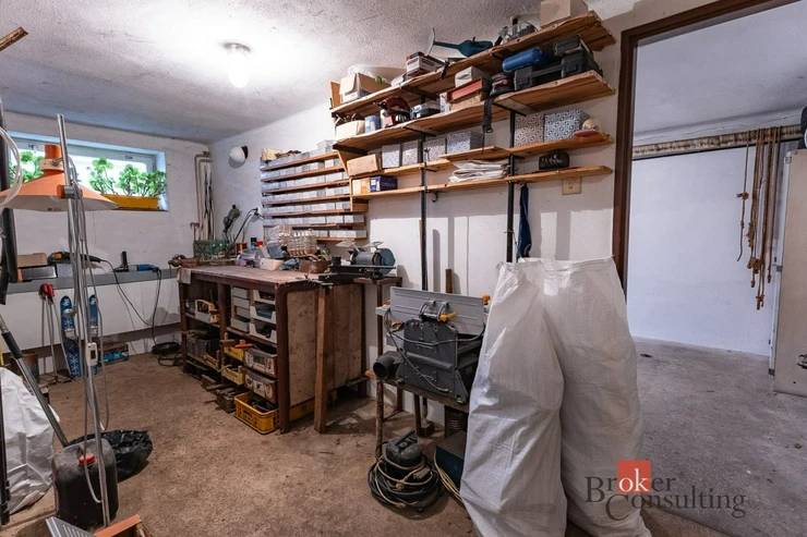 V suterénu se nachází garáž s dílnou, technická místnost a další prostory pro uskladnění věcí, včetně prádelny. V 1.NP je kuchyně, koupelna, WC, obývací pokoj, jídelní kout, ložnice a pracovna. Podkroví disponuje koupelnou, WC, ložnicí, obývacím pokojem a menší místností, kam je přiveden odpad a voda, a lze zde zbudovat další menší kuchyň. Dále jsou zde k dispozici menší úložné prostory a půda.