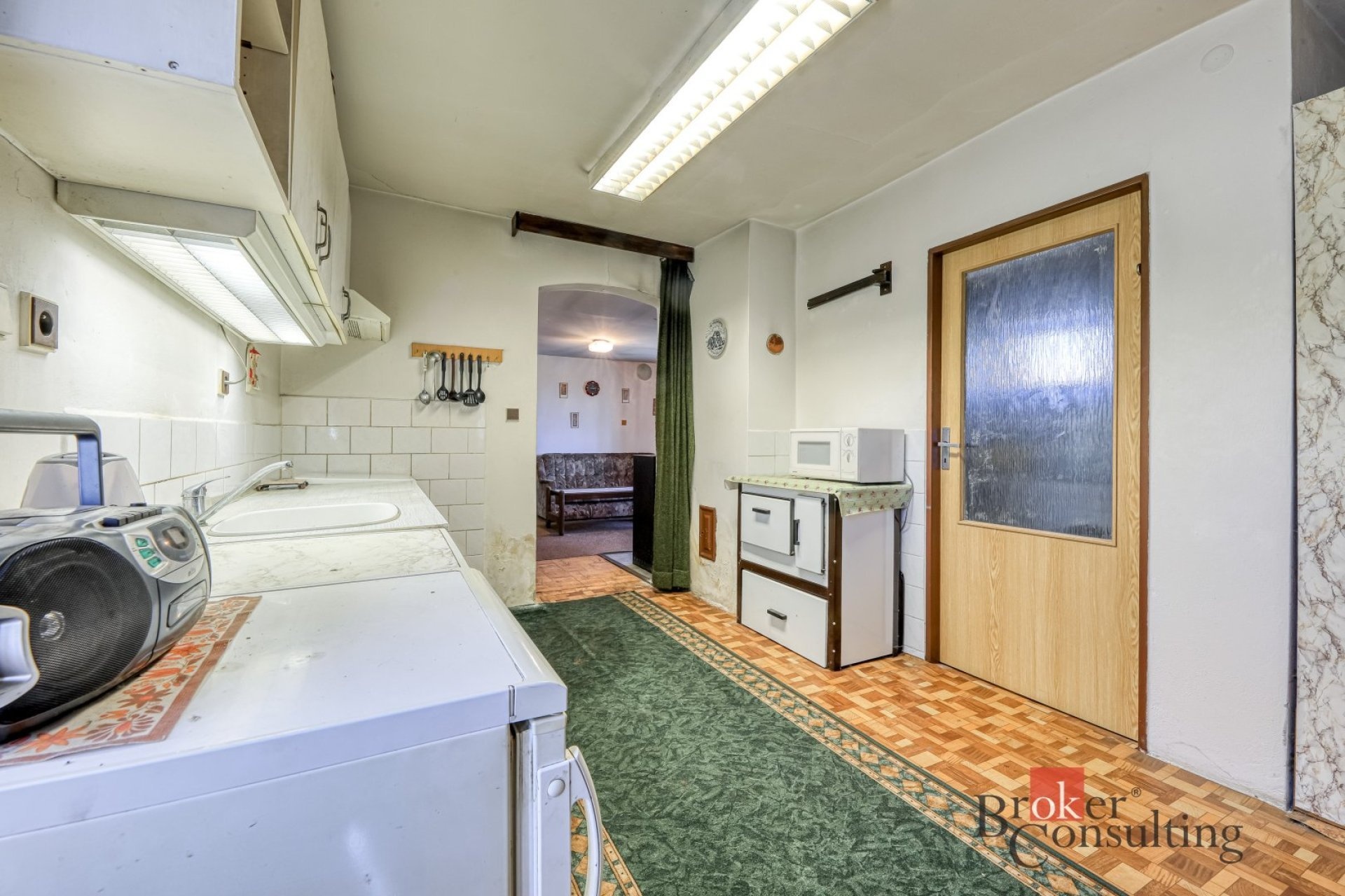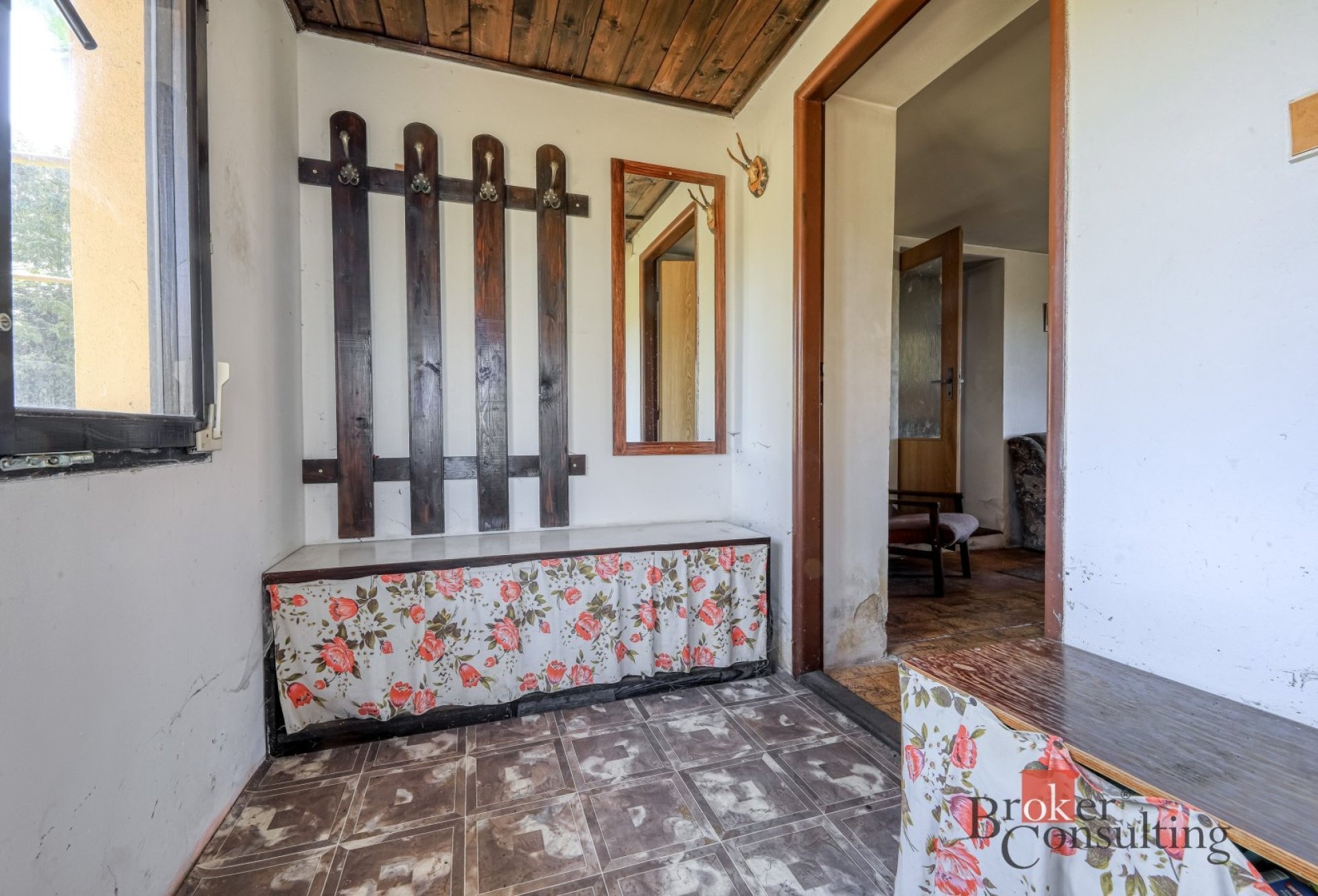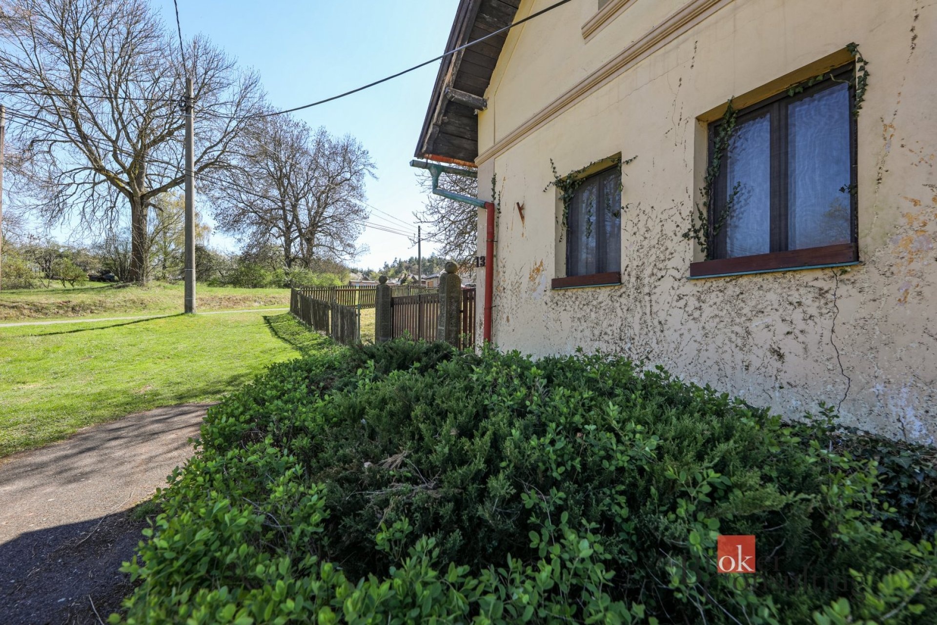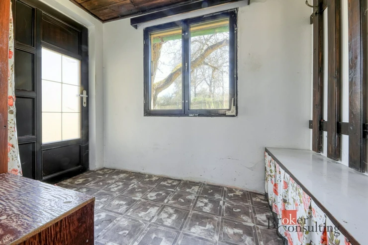 • Okna: Původní dřevěná, dokreslující autentický ráz stavby.
