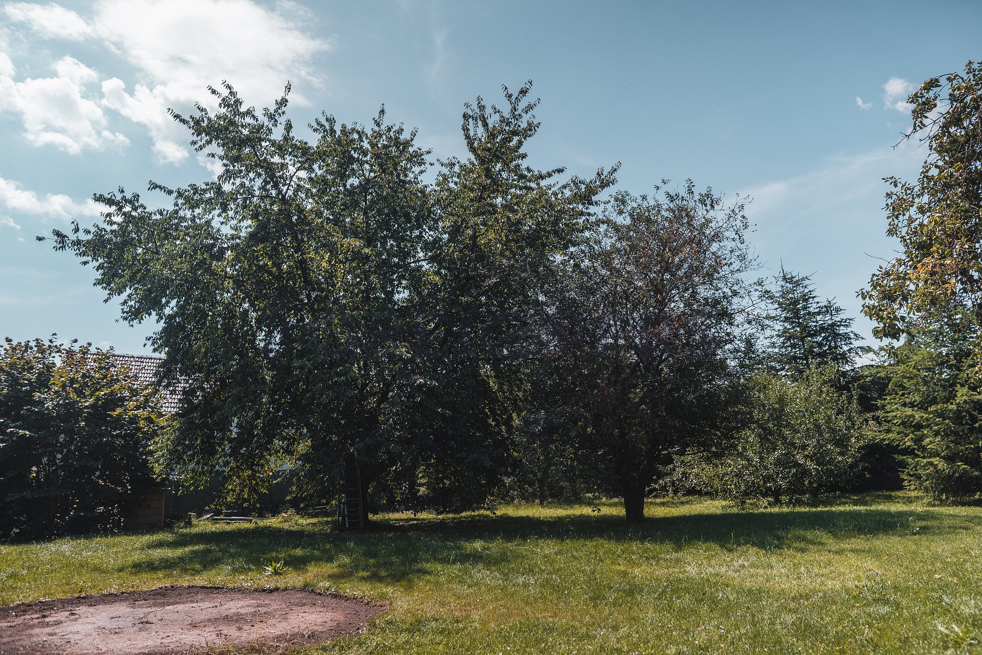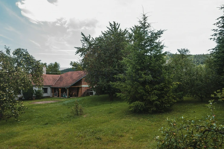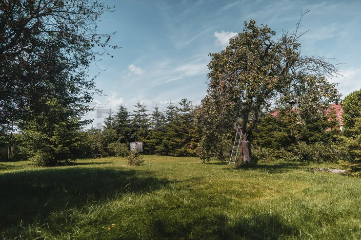 The plot is oriented to the west and southwest, ensuring plenty of sunlight in the afternoon and evening hours. The terrain is mostly flat with a gentle slope toward the west. Privacy is enhanced by mature evergreen trees (Pinus heldreichii – Bosnian pine) lining the boundaries of the property, and the natural atmosphere is completed by fruit trees – apple, cherry, and sour cherry – offering shade, seasonal fruit, and great potential for a future garden.
