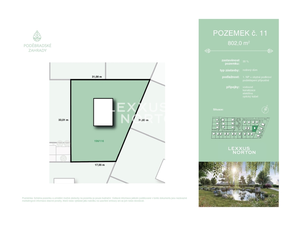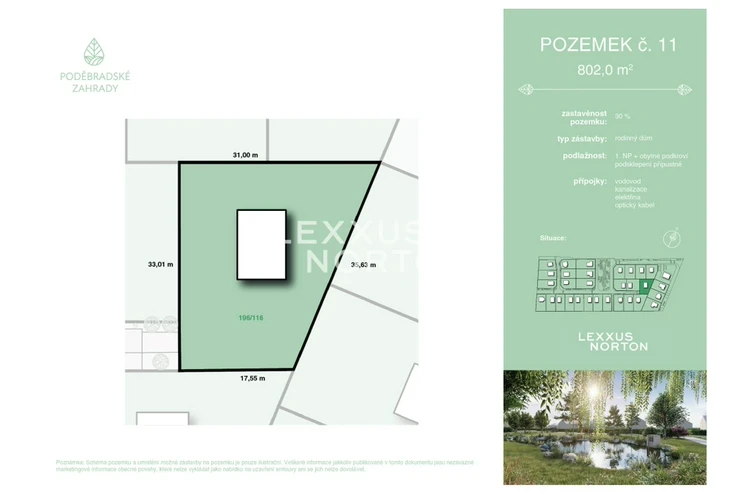 Live in your own house with a large garden, surrounded by the countryside and within reach of the unique atmosphere of a spa town.The new Podebrady Gardens project, which is being built on the outskirts of Chotanky in close proximity to the spa town of Podebrady, is selling a building plot with a total area of 802 sqm. The focal point of Podebrady Gardens is a generous eco-lake with park landscaping. There is a plan to plant a forest park in the near future and it will surround a large part of the whole area and become a pleasant landscape element.The precisely prepared plot with fully approved networks - electricity, water, sewerage and connection to data networks - is intended for the construction of a two-storey house. So the new owners just need to get a building permit and they can start construction.Naturally, the access roads, pavements and public lighting have been completed.The centre of Podebrady is only 5 minutes away by car or bus and Prague can be reached in 30 minutes along the motorway.The surroundings of Podebrady Gardens encourage an active lifestyle, with endless meadows and forests meandering through the beautiful Elbe lowlands, which you can enjoy thanks to the network of cycle paths. The project will then be connected to the well-known cycling and in-line route between Nymburk and Podebrady along the Elbe. In Podebrady, you will find local authority services, health care, primary and vocational schools, a grammar school, a theatre, a cinema and the popular farmers' markets. The exclusive atmosphere is enhanced by a Baroque château, a spa park with a colonnade, gourmet restaurants and an 18-hole golf course. You will then appreciate the beautiful lakes of Podebrady, ideal for swimming, fishing and romantic boating, not only in summer.