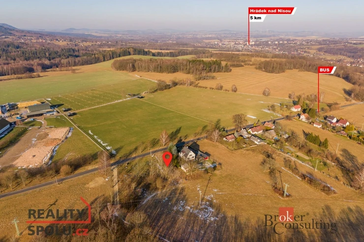 Občanská vybavenost a dostupnost: Do Hrádku nad Nisou cca 5–10 min autem (podle polohy v obci), do Liberce přibližně 20–25 min po rychlém tahu. Základní služby a MHD/vlak v dosahu okolních obcí.